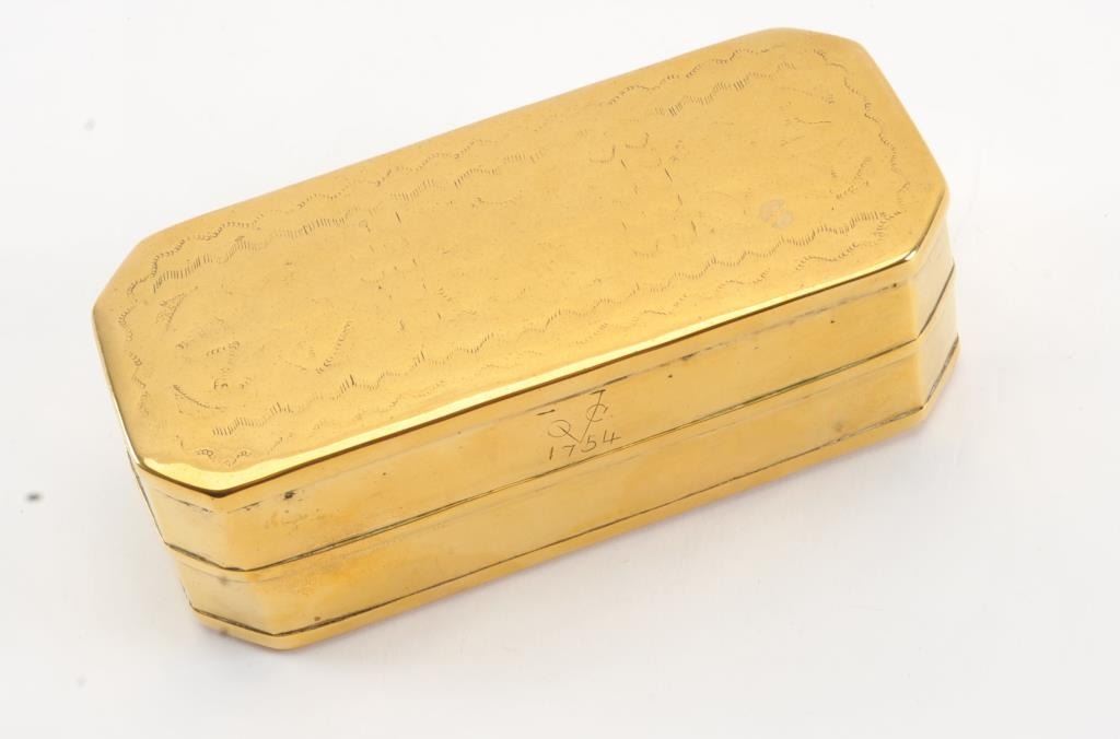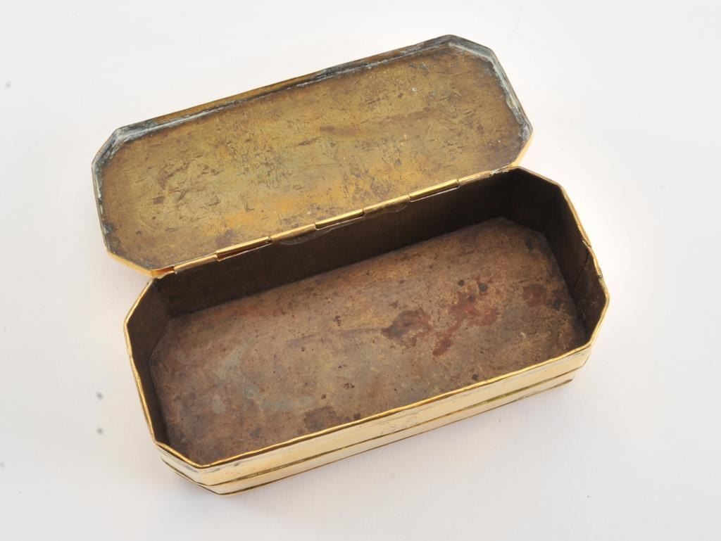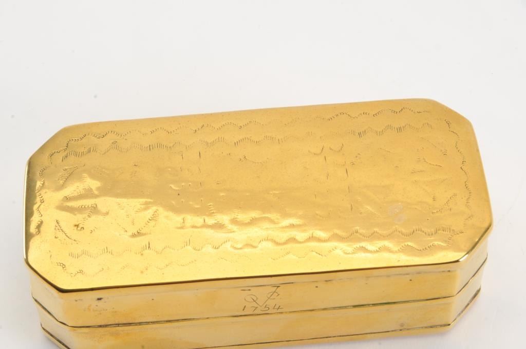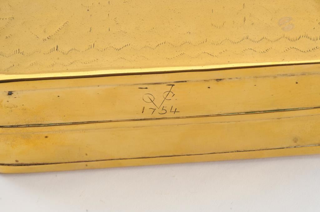 Brass tobacco box with east India Co. mark dated 1754. French and Indian war era. Measures 7” x 3”. Polished to where engraving is light. Est.: $150-300