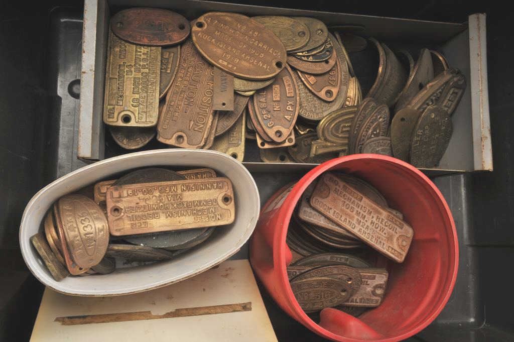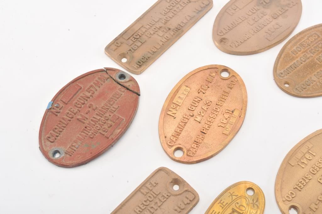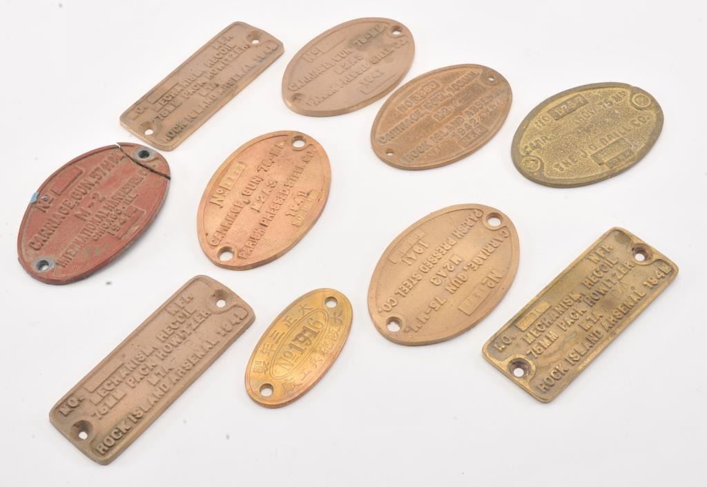 Bonanza lot of over 120 reproduction brass plaques for U.S. field guns and carriages, French, Oriental and other field guns and carriages; includes Howitzers, cannons, etc. Est.: $200-$400.