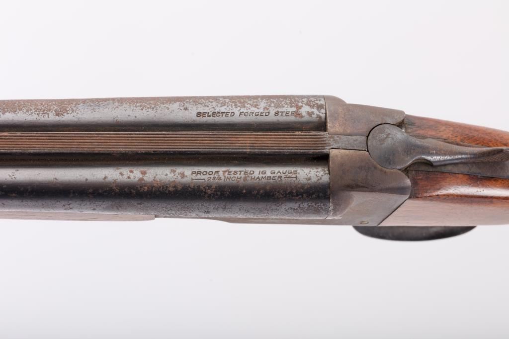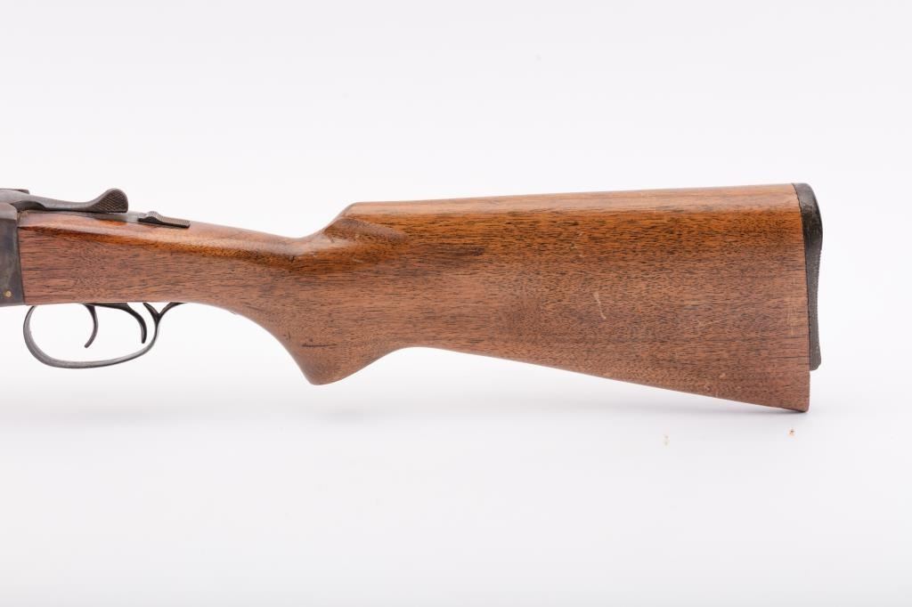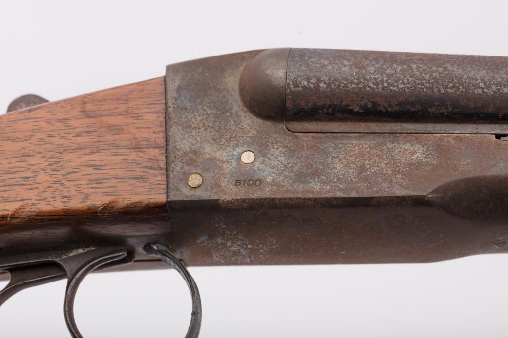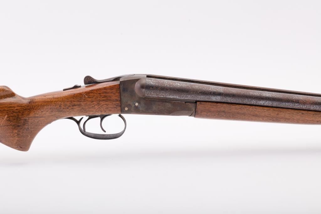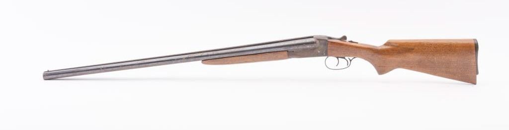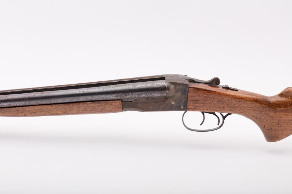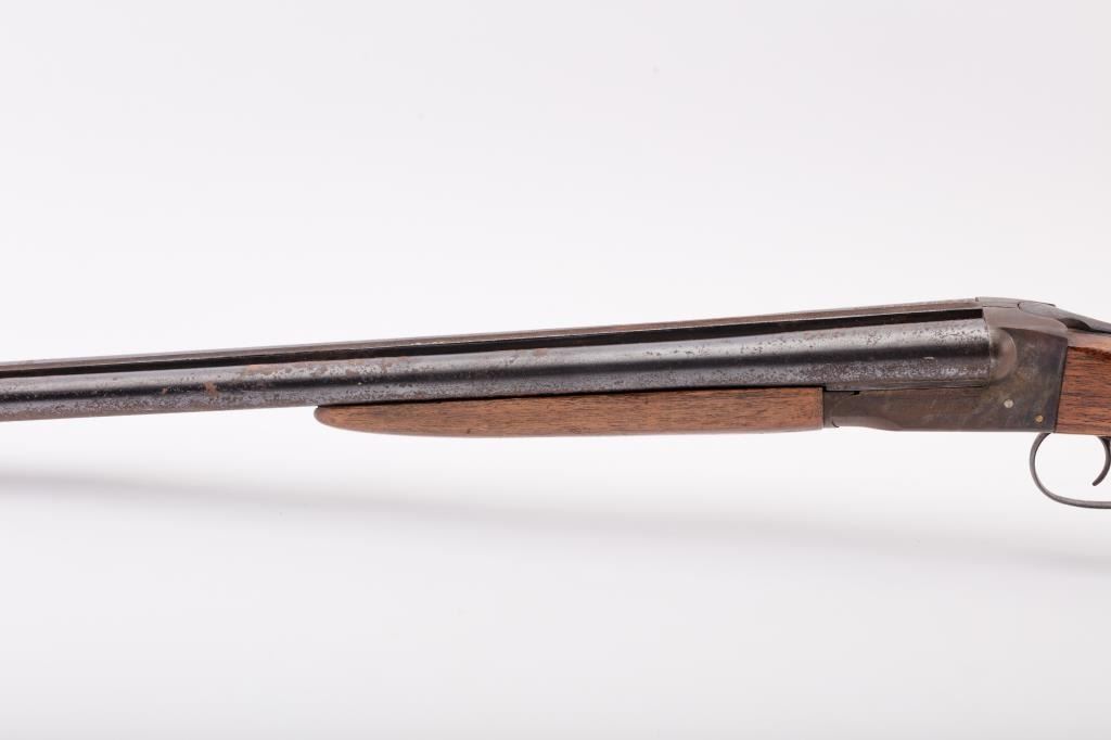 J. Stevens Company Springfield SXS double barrel shotgun, 16 gauge, Serial #NSNV. The shotgun is in fair overall condition with 28” barrels with a full-length rib and brass bead front sight. The barrels retain asignificant amount of their blue finish with light to moderate surface rust and pinprick pitting on both barrels. The receiver is shows dull case hardening with light surface rust, particularly evident on the underside. The smooth wood stocks are in fair condition with mars, dents and scratches. The butt stock ends with a broken hard plastic butt plate providing a 14" LOP to the front trigger. The bores are fair, the actionfunctions and the markings are legible. Est:$125-250 (C&R)