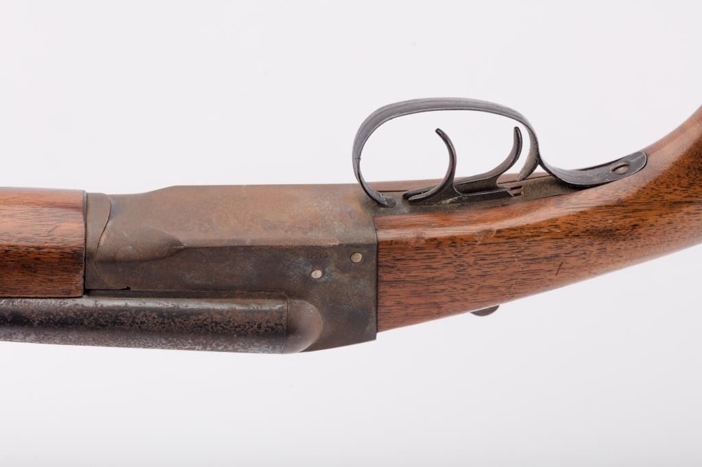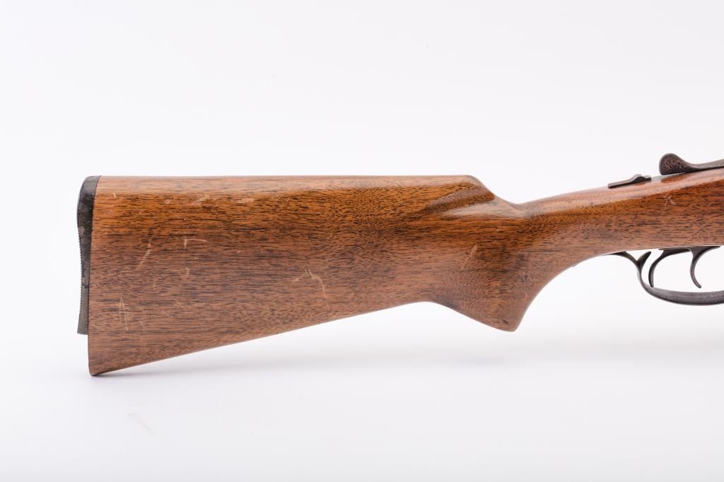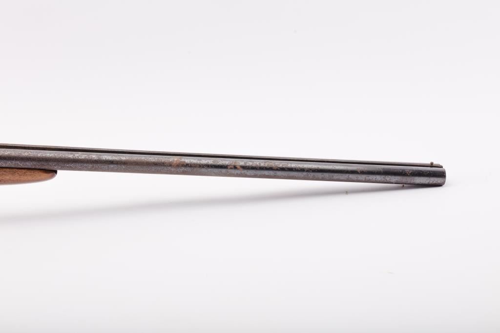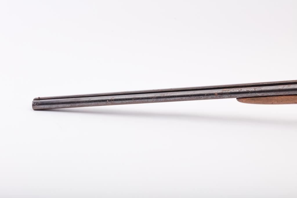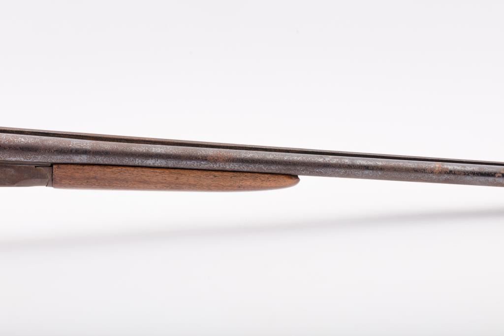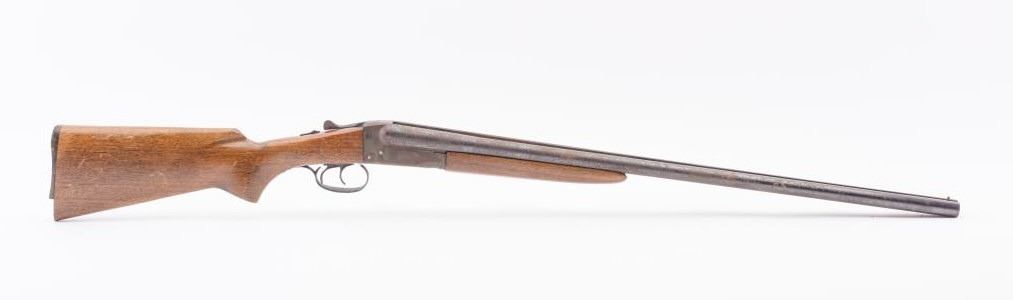 J. Stevens Company Springfield SXS double barrel shotgun, 16 gauge, Serial #NSNV. The shotgun is in fair overall condition with 28” barrels with a full-length rib and brass bead front sight. The barrels retain asignificant amount of their blue finish with light to moderate surface rust and pinprick pitting on both barrels. The receiver is shows dull case hardening with light surface rust, particularly evident on the underside. The smooth wood stocks are in fair condition with mars, dents and scratches. The butt stock ends with a broken hard plastic butt plate providing a 14" LOP to the front trigger. The bores are fair, the actionfunctions and the markings are legible. Est:$125-250 (C&R)