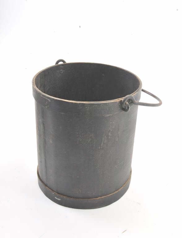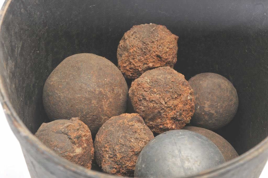 Old iron cannon ball field gun bucket with rusty cannon balls, various sizes; approximately 10” in height and 9” in diameter. Est.: $200-$400.