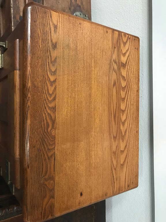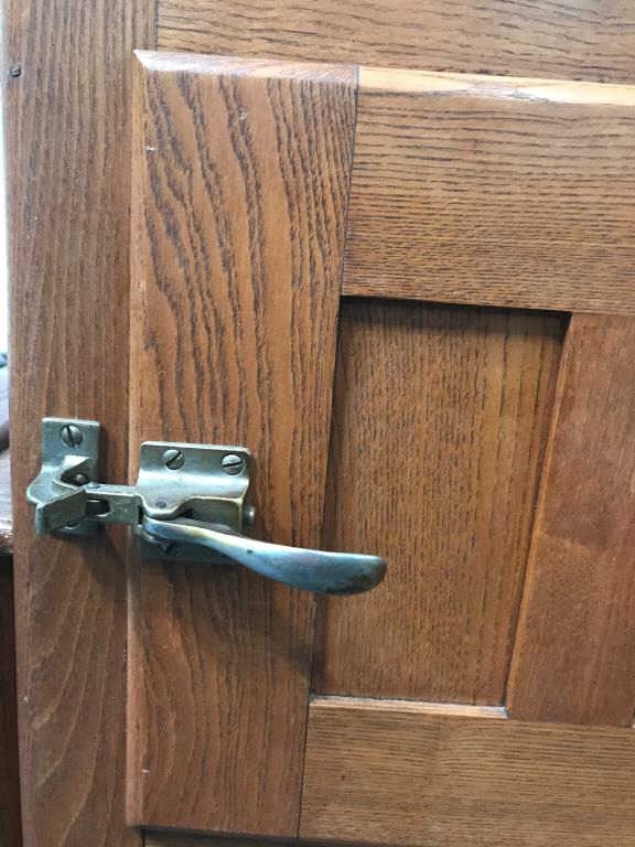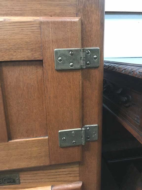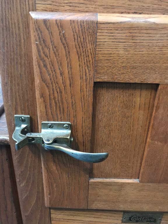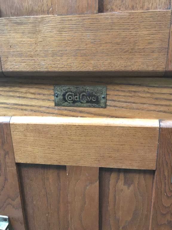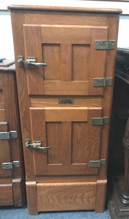 Desirable refinished antique oak ice box with tin lined interiors, double compartments and “Cold Cave” brass name tag; approximately 46” in height, 20” wide and 15” deep. Est.: $250-$450.