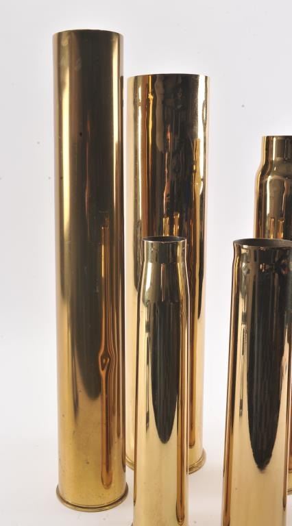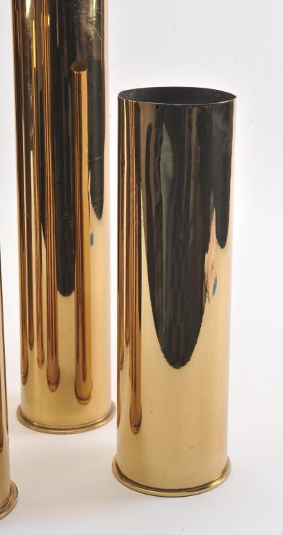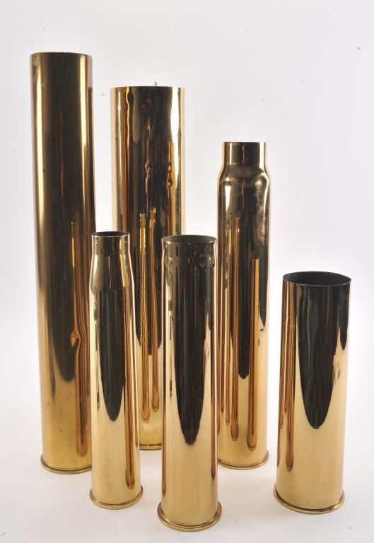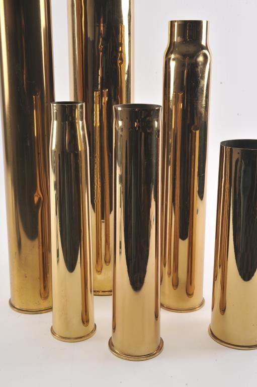 Lot of 6 large polished brass military gun shells and a dummy practice bomb; shells dimensions are: 15” in height with 4” diameter; 17” in height with 2.5” diameter; 17” in height with 3” diameter; 23” in height with 3” diameter; 27” in height with 5” diameter and 28.5” in height with 4” diameter. The dummy practice bomb is approximately 37” overall and marked “Edw. G. Budd Manf. Co./MK III” and also has numbers“151” and “6” marked on the shell. Est.: $175-$350.