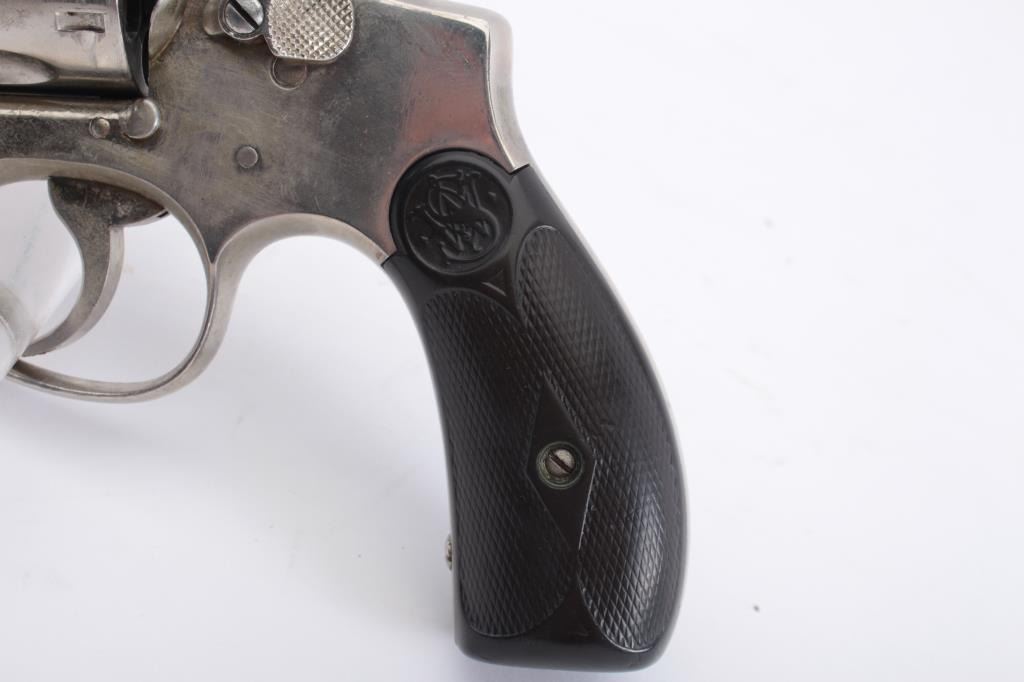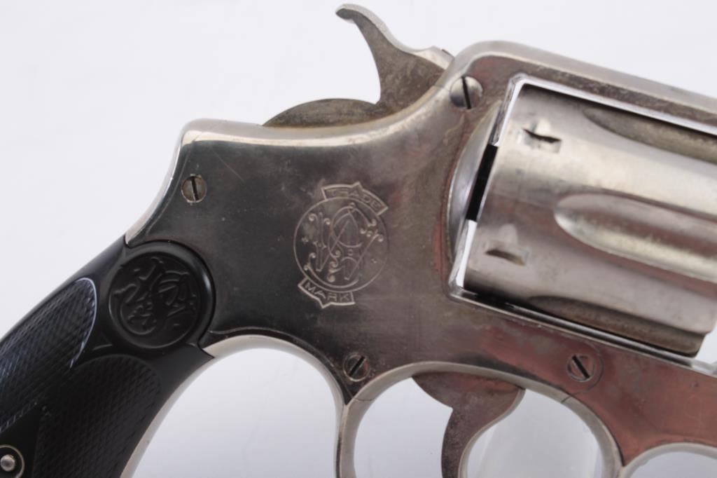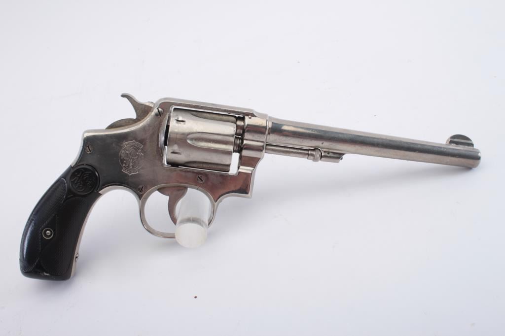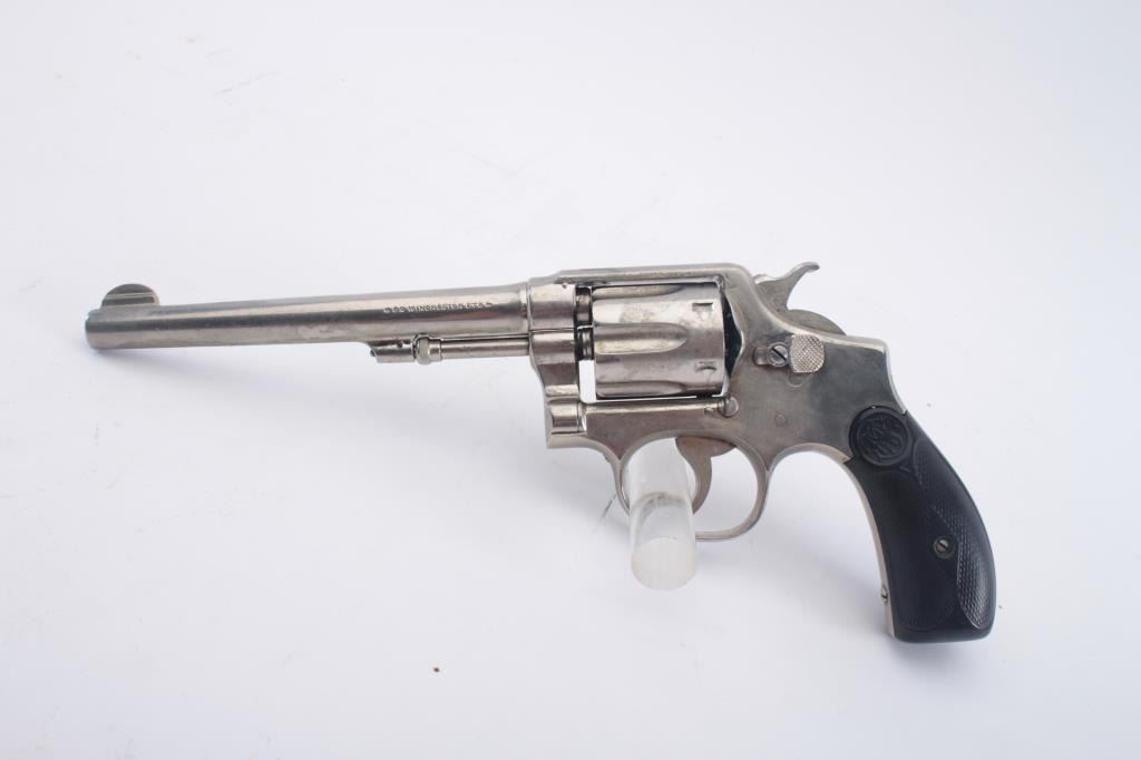 Smith & Wesson Model 1905 M&P DA revolver, .32 Winchester caliber, 6.5” barrel, old re-nickel finish, checkered black hard rubber grips, S/N 20011; overall fair to good condition as re-finished; fair bore, 5-screwframe, majority of re-nickel remaining, action working but trigger return spring is not returning without assistance; grips show an old repaired crack to bottom of right grip. (C&R). Est.: $150-$300.
