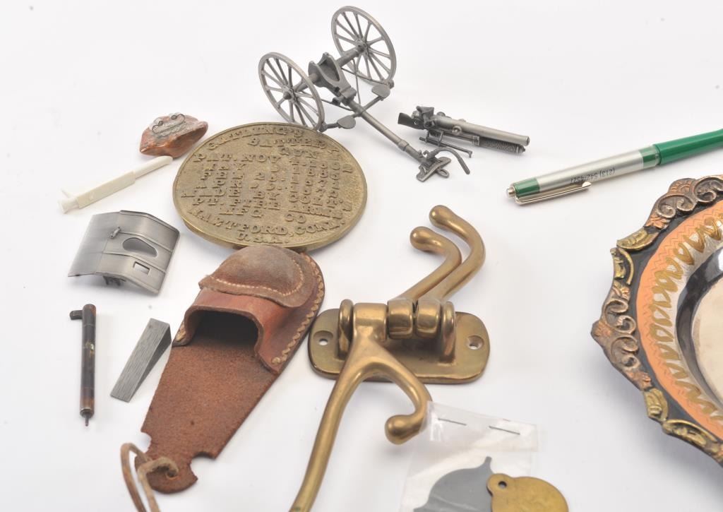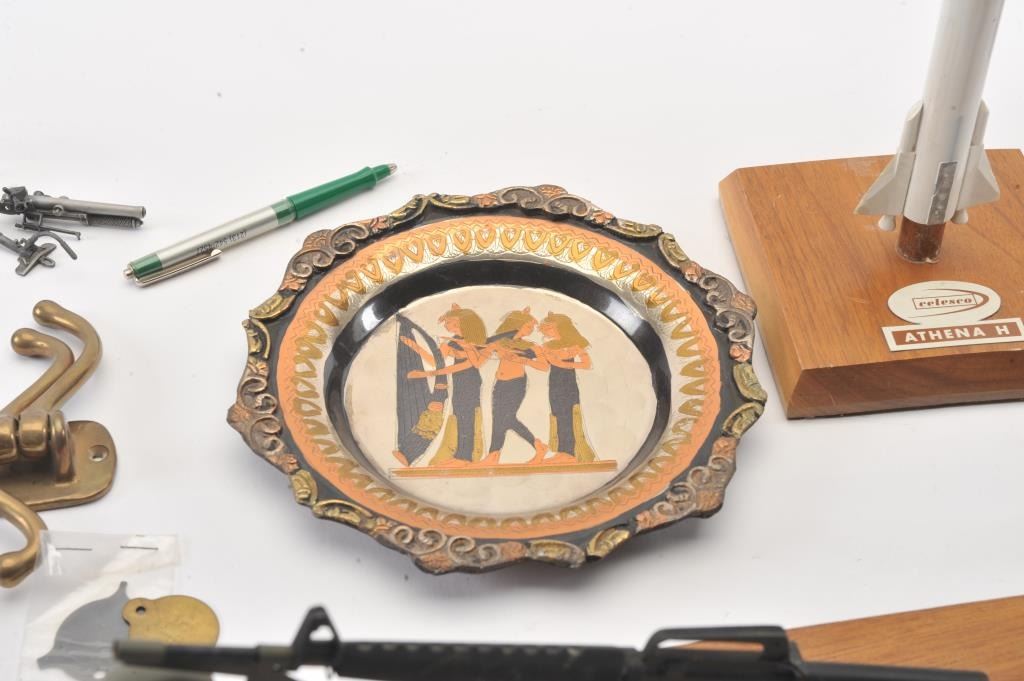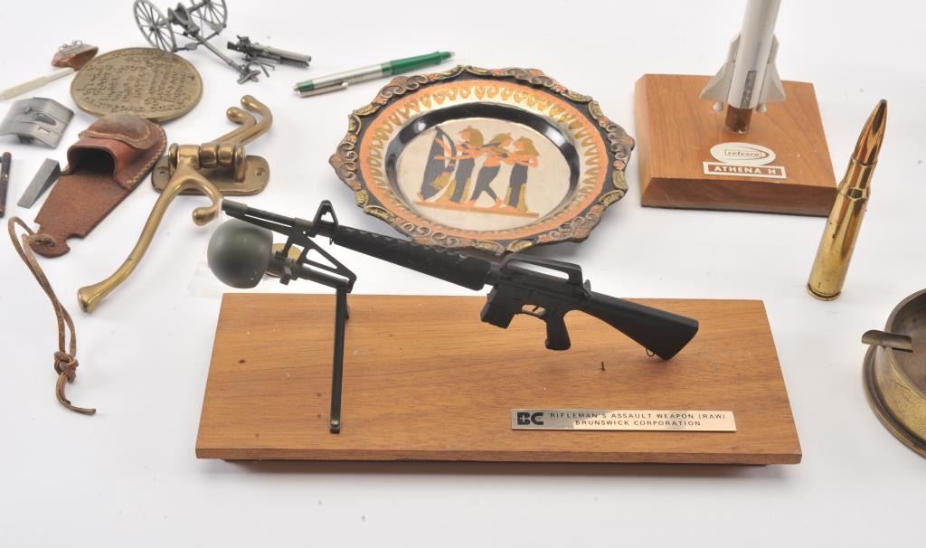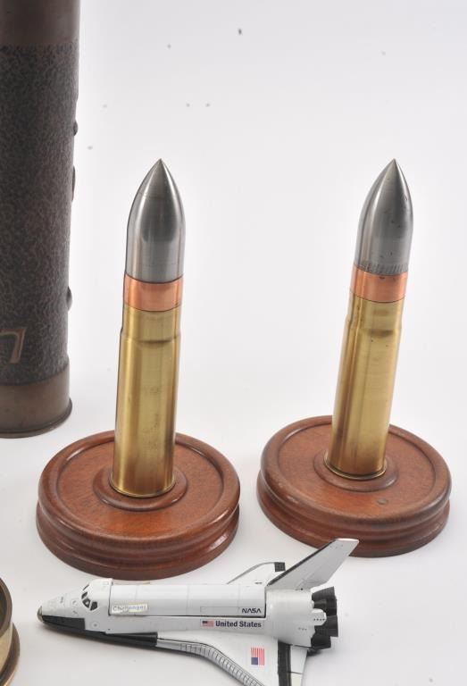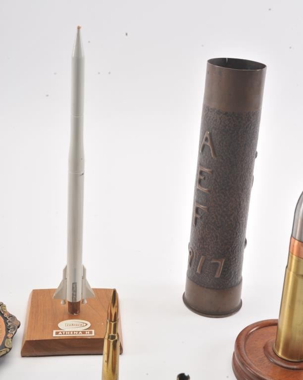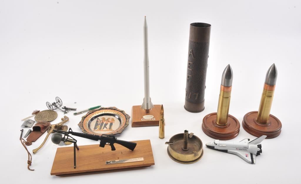 Lot of misc. smalls including a piece of trench art with included marking “AEF/1917”; a brass shell ashtray; two military shells on matching wood bases; two plastic toys: one a U.S. Army rocket, the other a U.S.Challenger Spaceship and more. Est.: $150-$300.