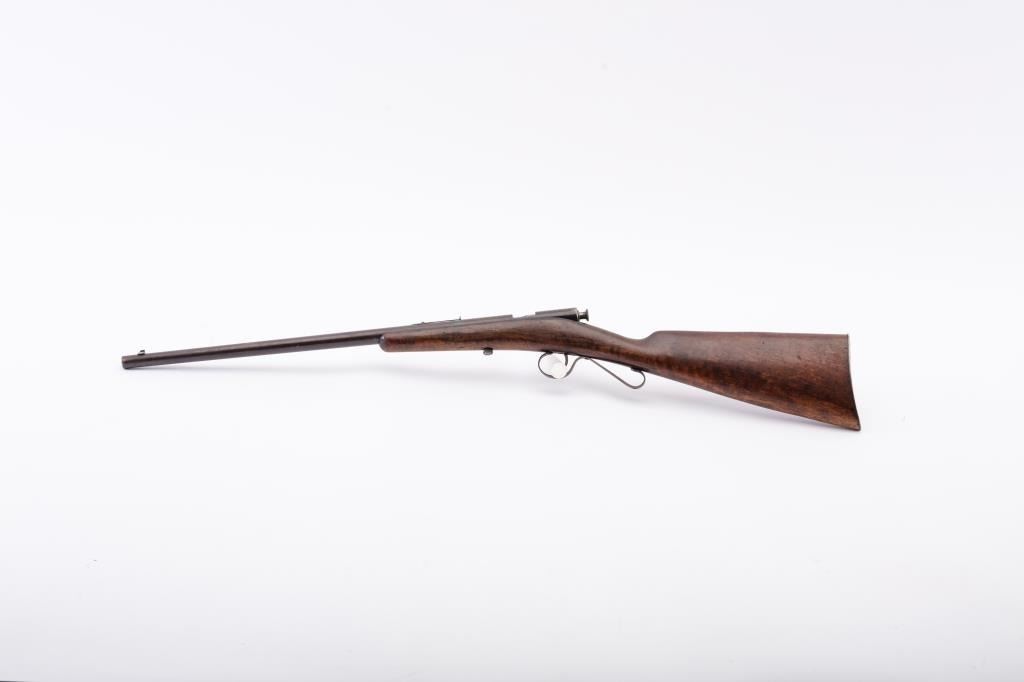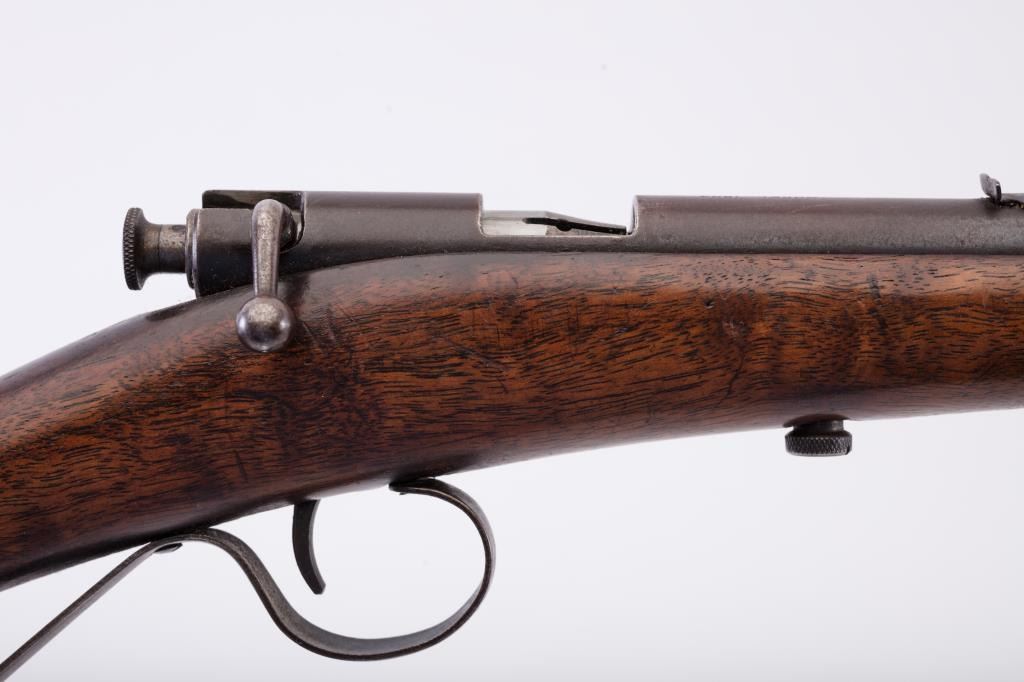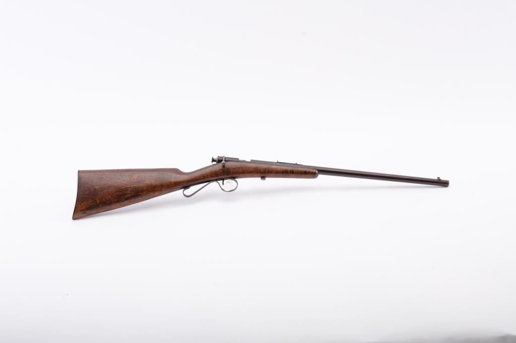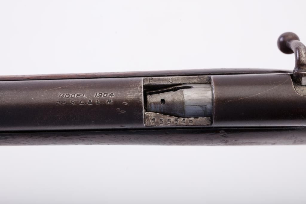 Savage Model 1904 .22 Bolt action single shot boys rifle in good to very good overall condition. Blue has gone to patina. The wood is good with normal scratches and mars. Good markings. S/N 15549. Not locking andextractor is missing. (C&R) Est.: $125-$250
