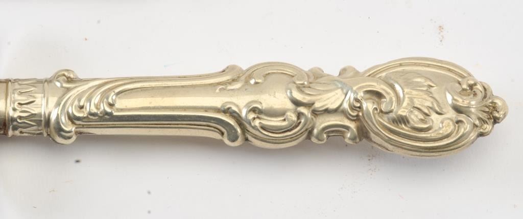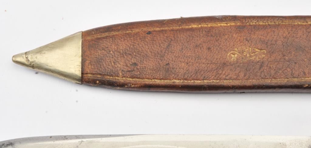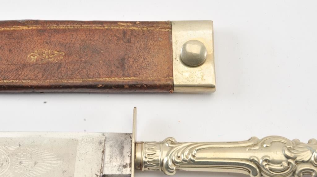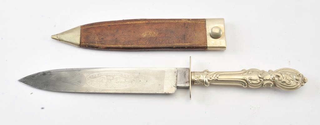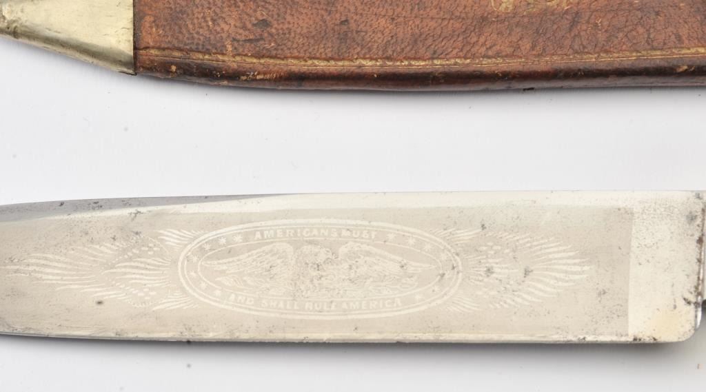 Cutlery handled spear point Bowie with fancy etched blade showing American eagle and slogan “America must, and shall rule America”. With scabbard. Very good plus to almost fine. Circa 1850-1890. The blade shows 90%-95% etching and original polish. Measures 11 ½” overall with a 7” blade. From a premier collection. Est.: $750-$1500
