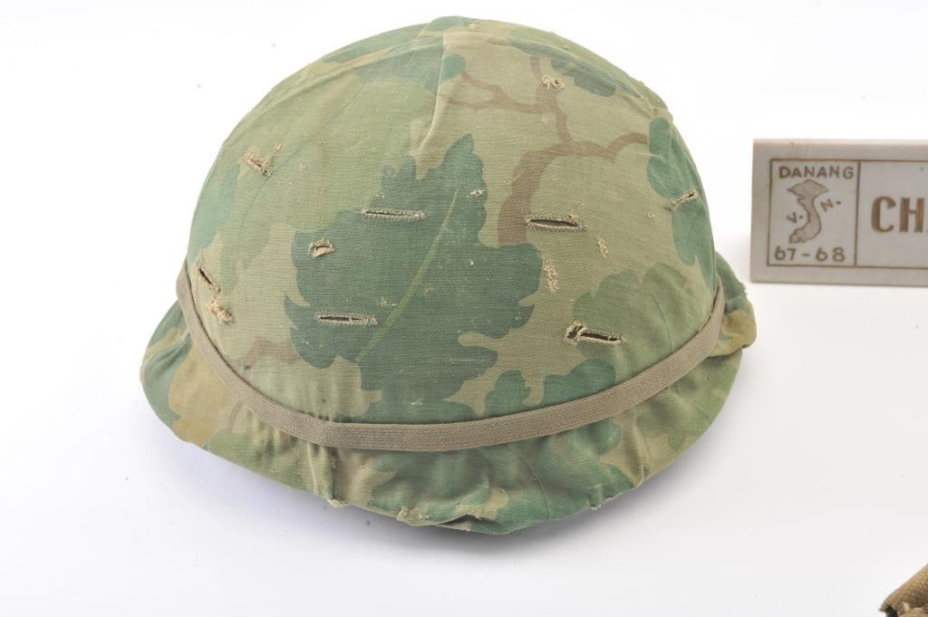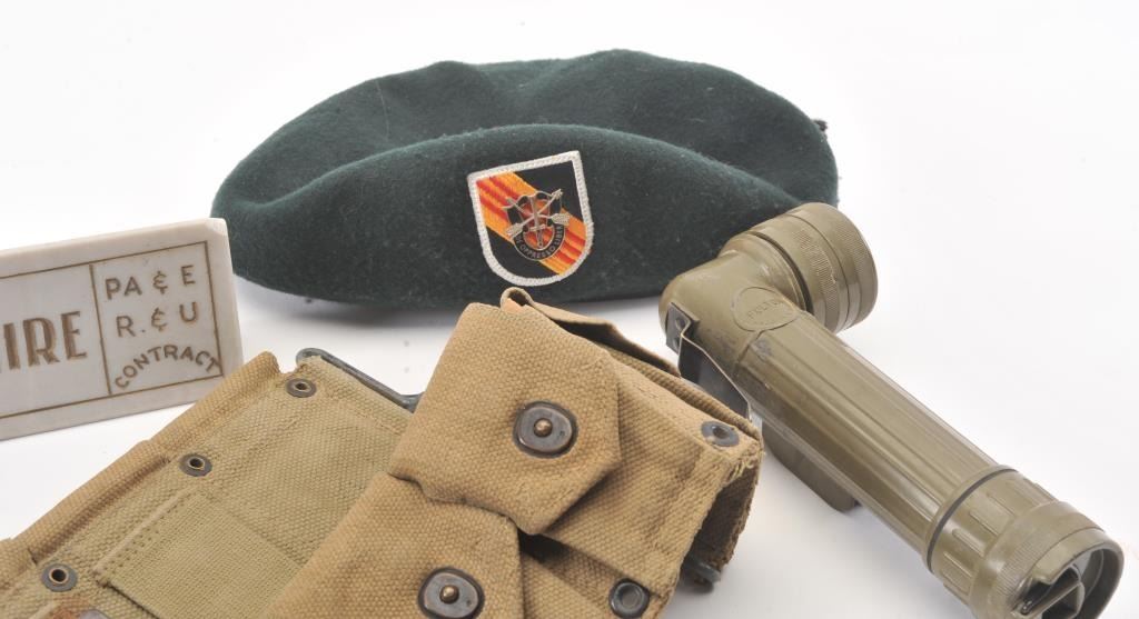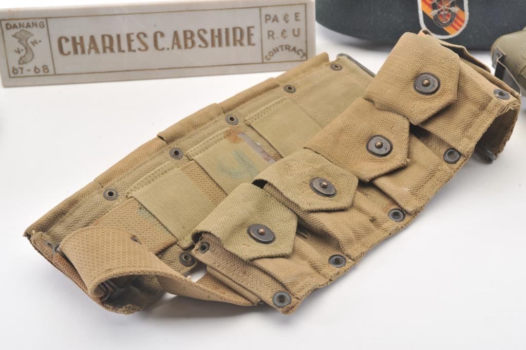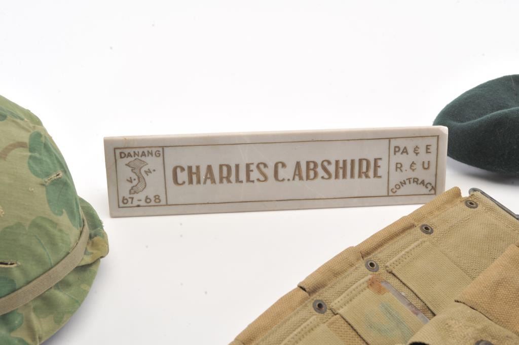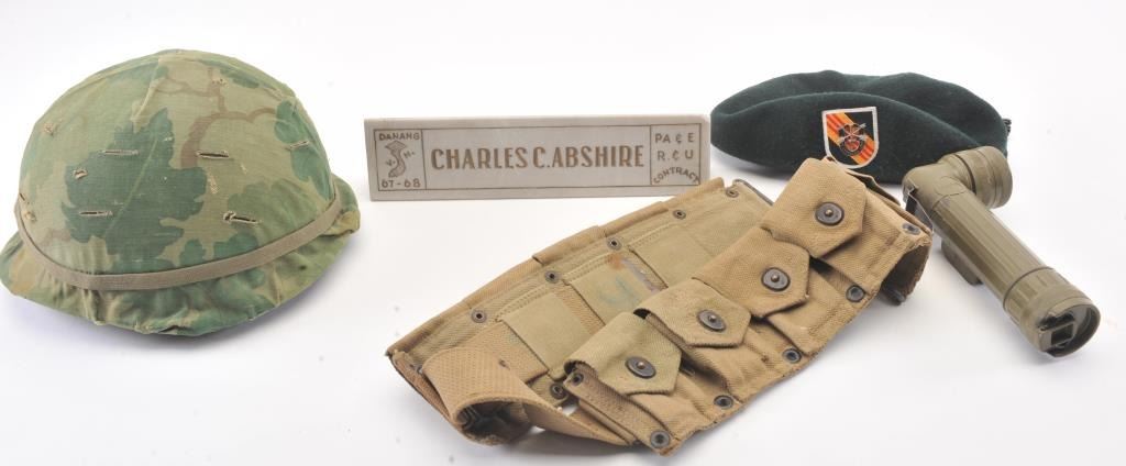 Lot of small military collectibles from the estate of well-known Southern California collector Chuck Abshire; includes an engraved desk name plaque marked “Charles C. Abshire/PA & E/R & U Contract/ DA NANG V.N.67-68” (bottom of desk plaque shows green hand written note: “Marble Mountain/DA NANG V.N./1968”); also a U.S. Camo covered helmet with liner, a military green beret by Bancroft with sword and crossed arrowsmedallion on patch with “DE OPPRESSO LIBER”; a Fulton MX 99NU green plastic flashlight and a tan 1942-dated woven belt ammo carrier by Hinson Mfg. Co. Est.: $150-$300.