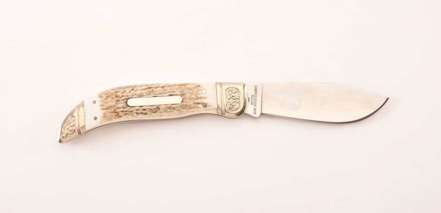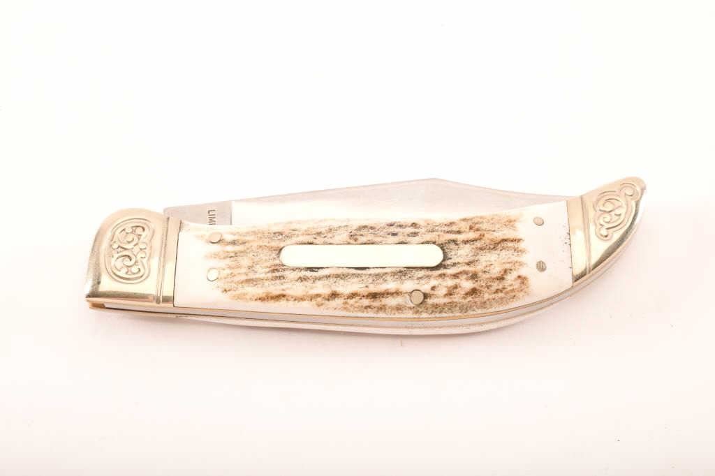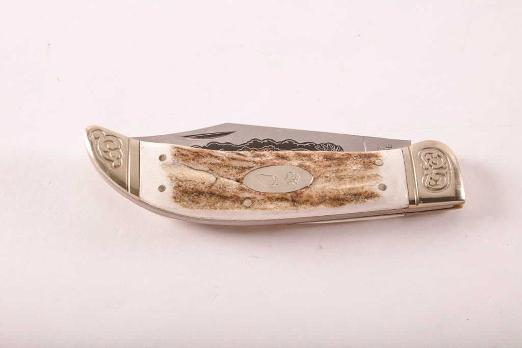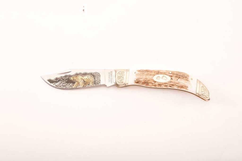 Schrade Handmade folding pocket knife, marked “Limited Issue 2008/SCLGS”; bear decoration on left side of blade; approximately 9.5” overall unfolded with a 4.25” blade; fine condition. Est.: $50-100