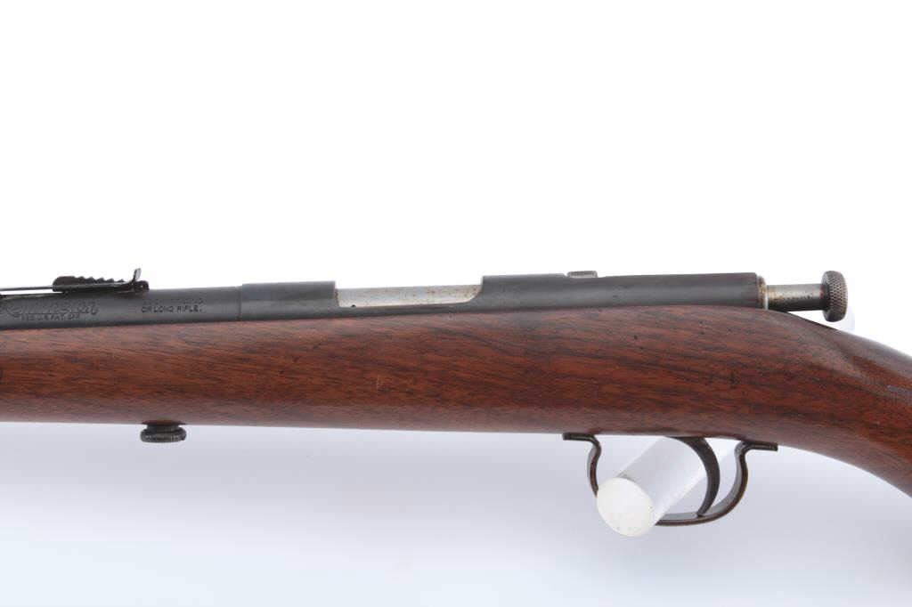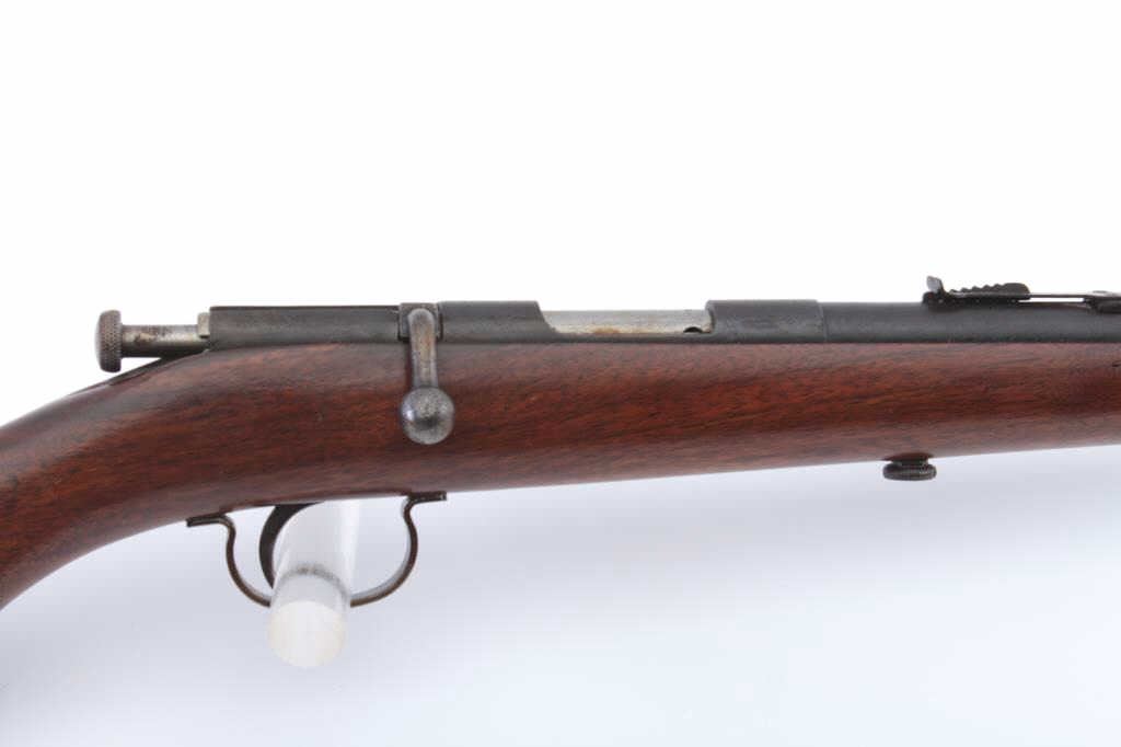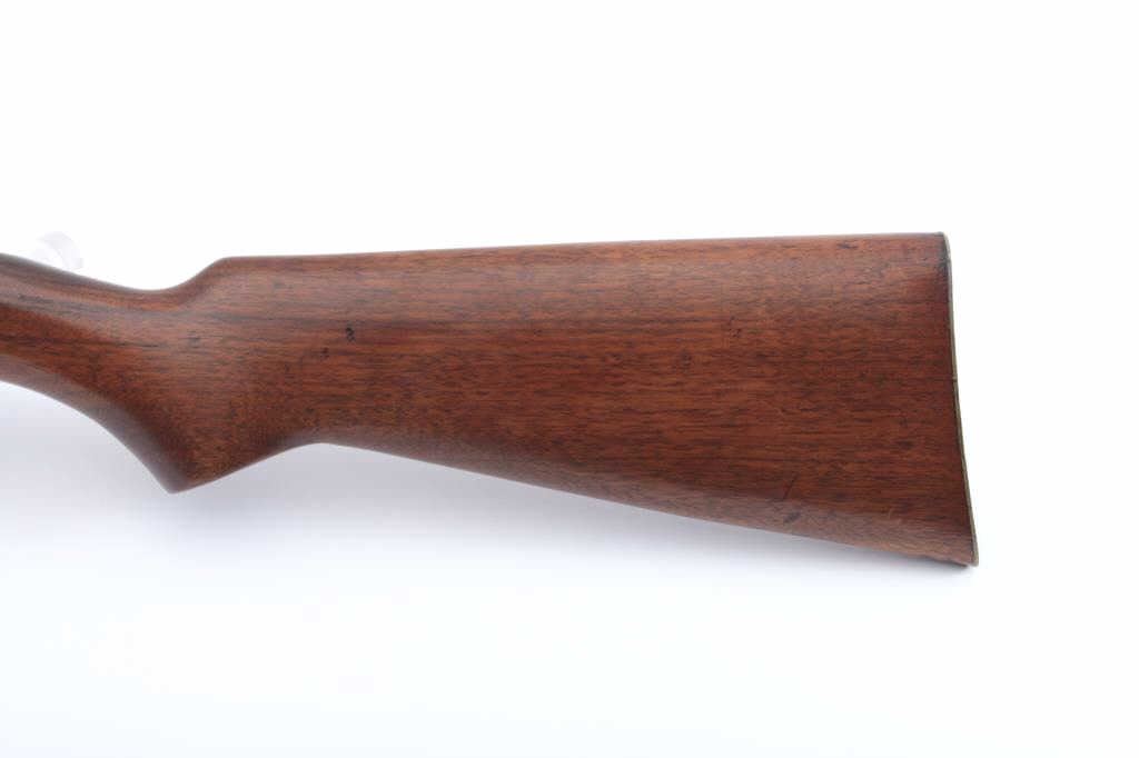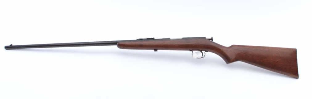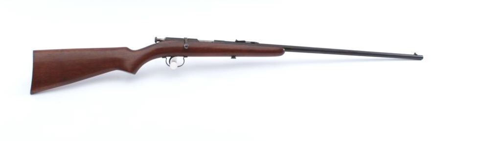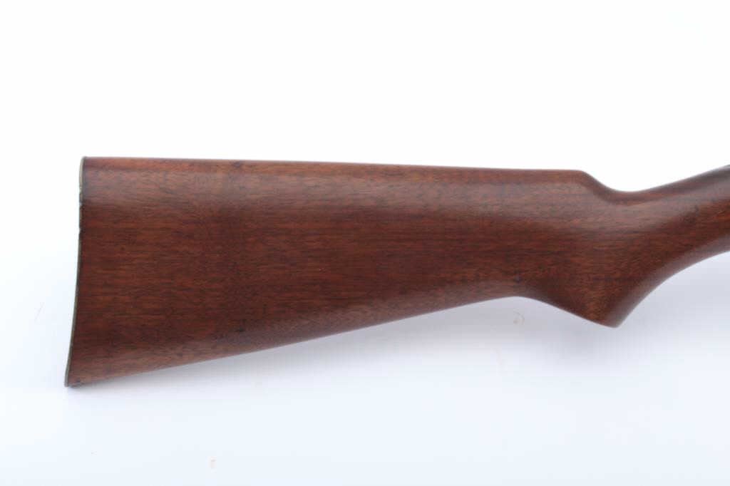 Remington Model 33 bolt action rifle, .22 short, long or LR caliber, 24” barrel, blued finish, wood stock, no visible S/N; overall good condition showing majority of muted blued finish with scattered pinprick pittingon the barrel, good bore, good action, sharp markings and good wood stock. (Modern). Est.: $80-$160.
