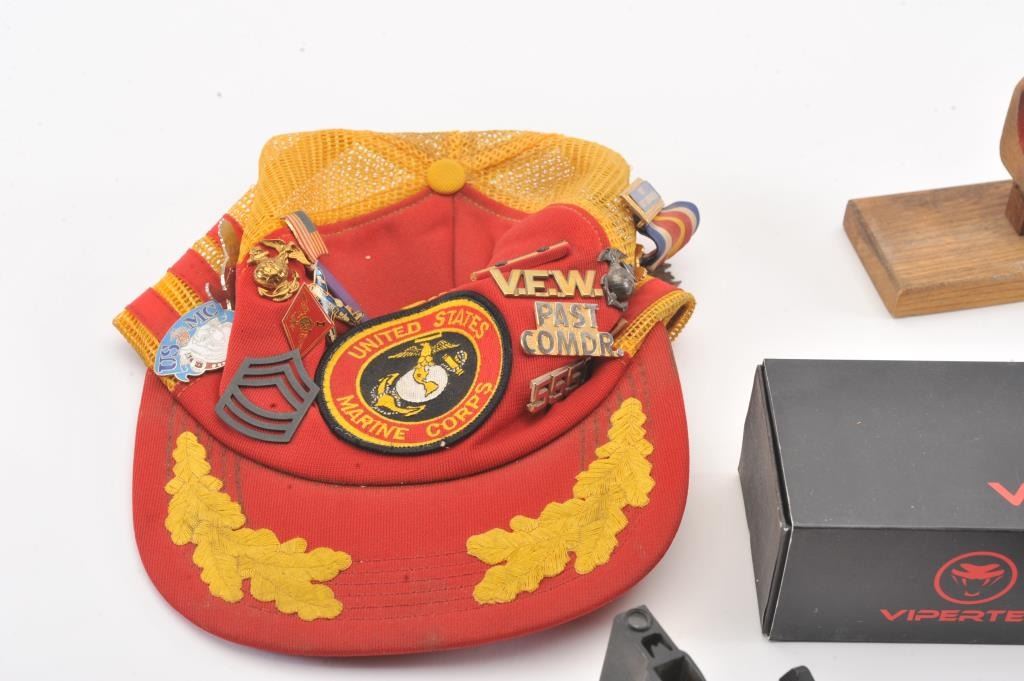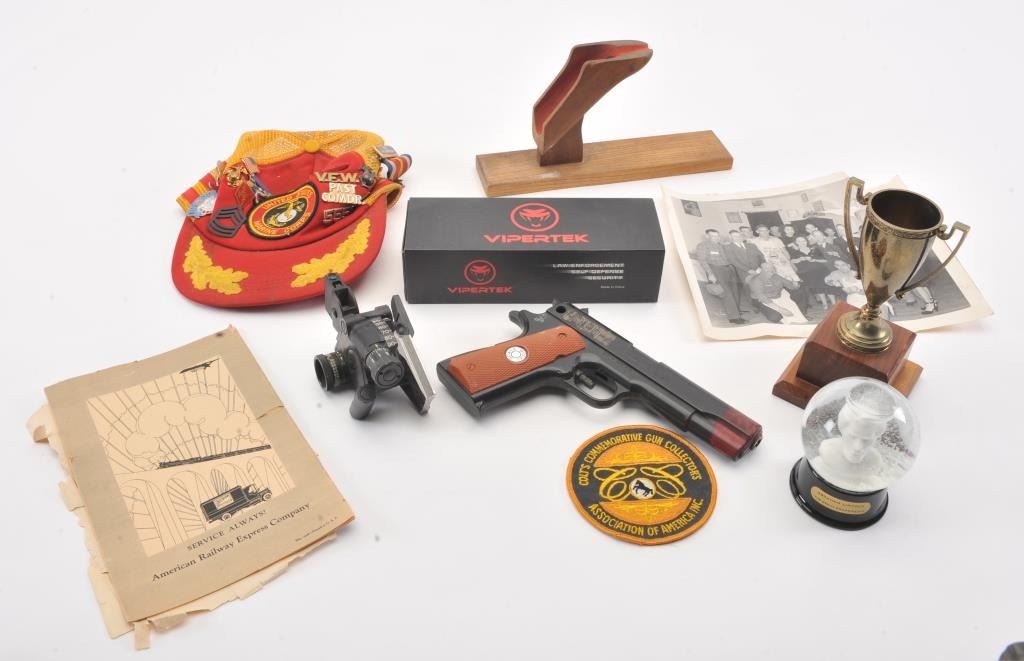 Lot of approximately two dozen small collectibles from an old Apple Valley, CA estate; includes a Vipertek high power flashlight like new in factory box, an old Abraham Lincoln snow globe, several vintageold eye glasses with cases, an old M4 U.S. military sight, several U.S. veterans’ post medals and more! Est.: $150-$300.