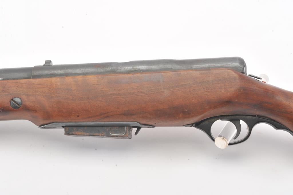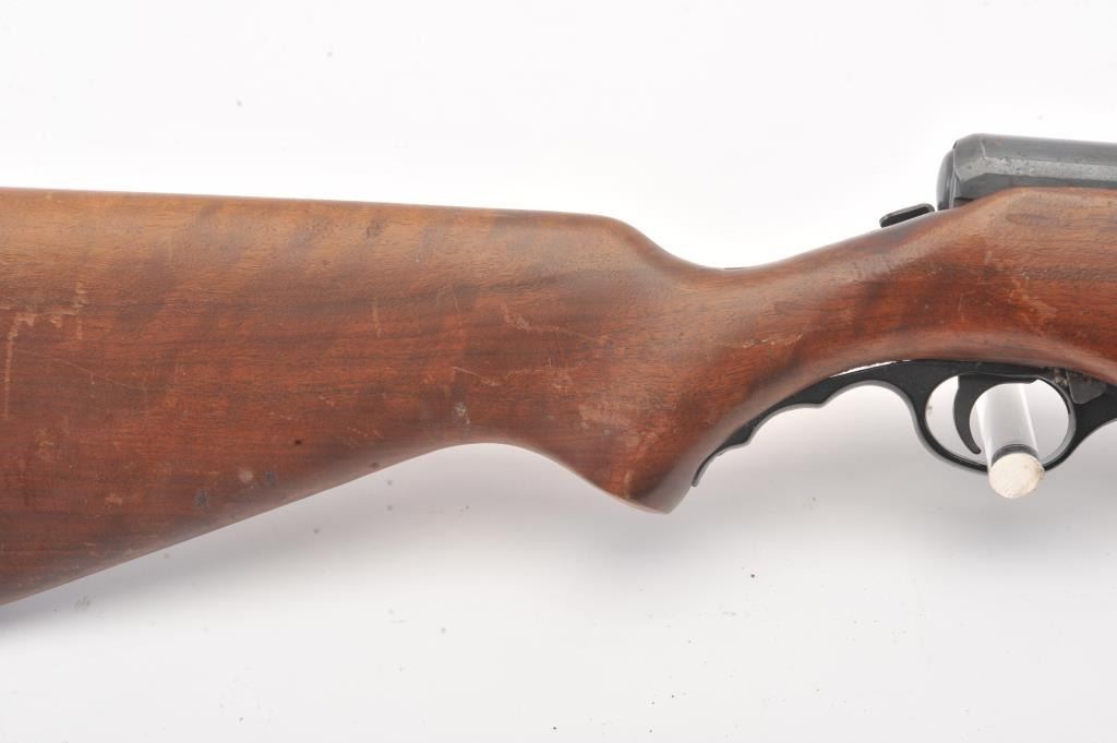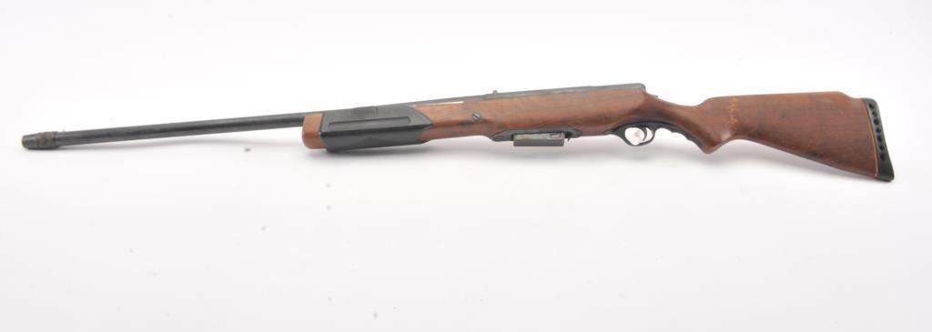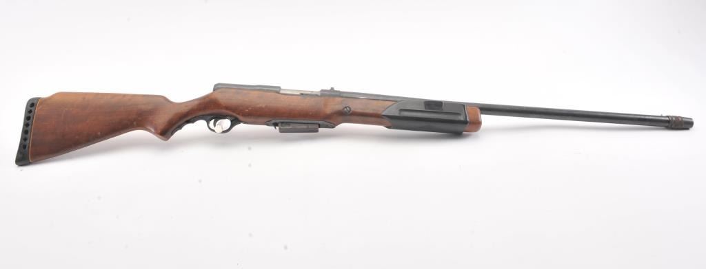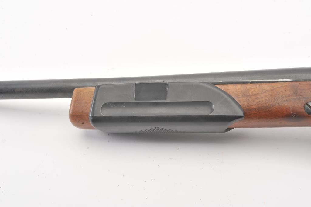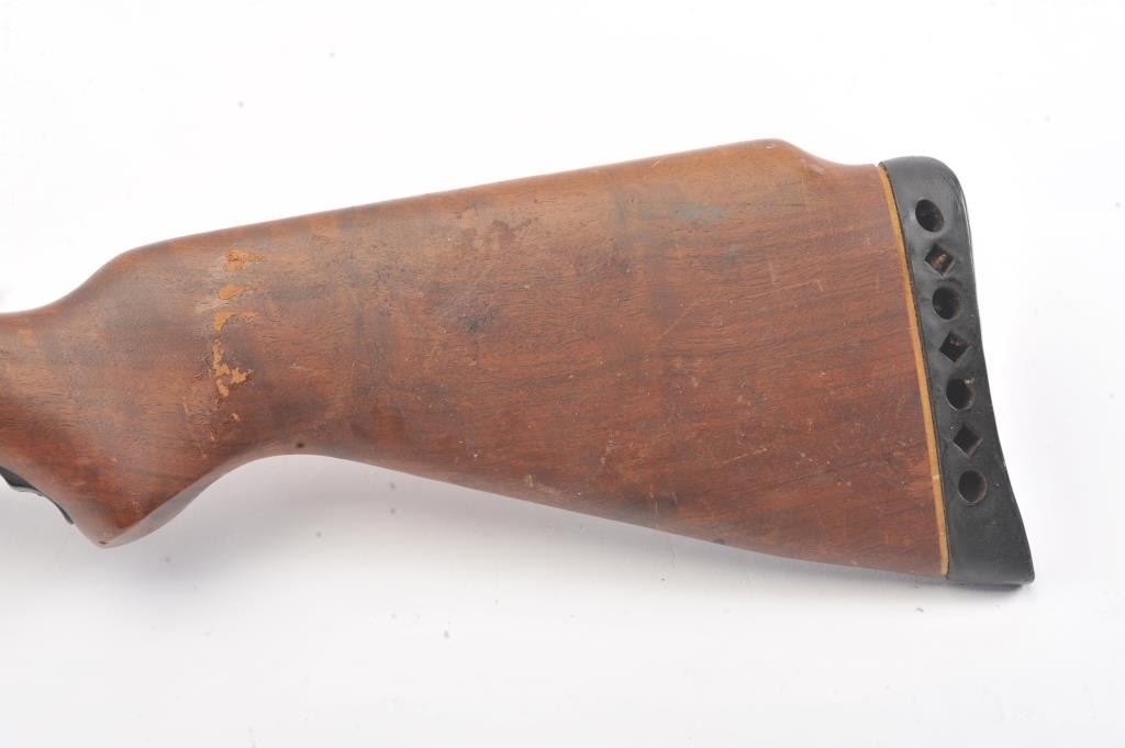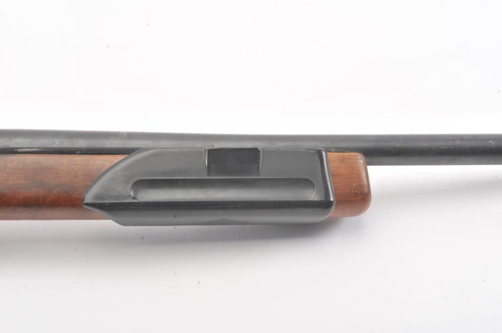 Mossberg Model 200 pump shotgun, #NSNV, 12 Ga., 2 3/4" chamber, 26 1/2" barrel, blued finish, detatchable box magazine, plain wood stock with rubber recoil pad, and screw on external full choke. Shotgun is in fair togood condition overall with light surface rust which should easily clean, plastic trigger guard is cracked (easily replaced), wood is good, with minor cracks at the screw on each side behind the pump. The gun wouldimprove greatly with a good cleaning. Action is good, bore needs cleaning. (C&R) Est. $25-50