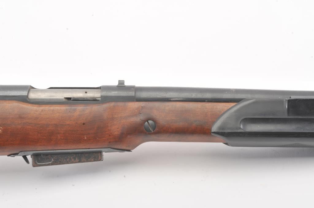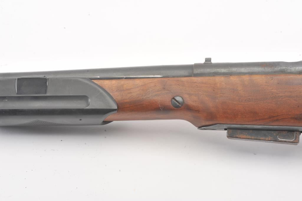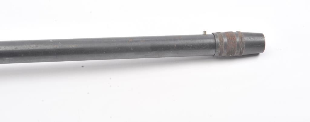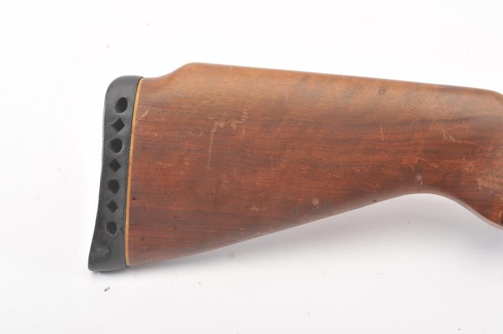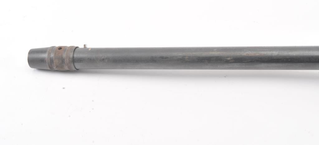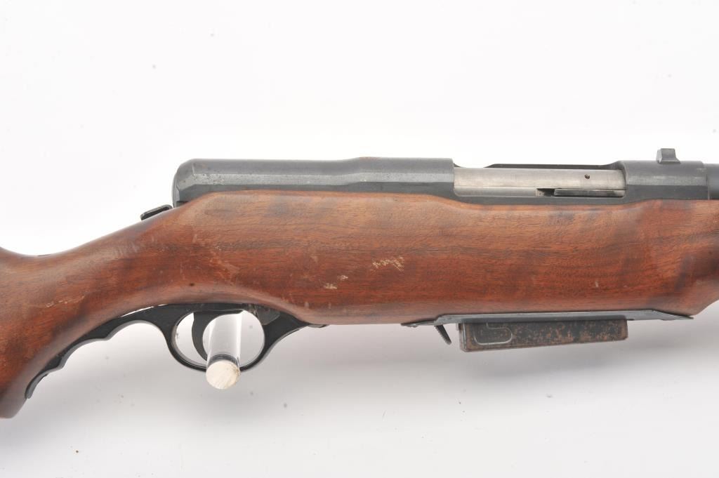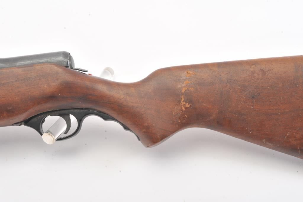 Mossberg Model 200 pump shotgun, #NSNV, 12 Ga., 2 3/4" chamber, 26 1/2" barrel, blued finish, detatchable box magazine, plain wood stock with rubber recoil pad, and screw on external full choke. Shotgun is in fair togood condition overall with light surface rust which should easily clean, plastic trigger guard is cracked (easily replaced), wood is good, with minor cracks at the screw on each side behind the pump. The gun wouldimprove greatly with a good cleaning. Action is good, bore needs cleaning. (C&R) Est. $25-50