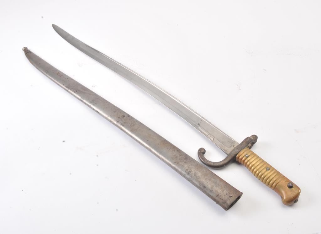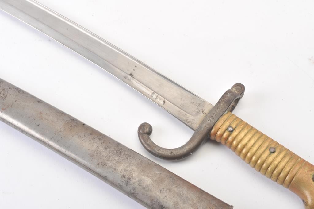 French sword bayonet with scabbard marked “MFG Imp. De St. Etienne 18 (illegible) possibly 78. S/N 70261 on the hilt and matching scabbard. Good to very good overall. Minor rust and erosion on scabbard. Est.:$50-$100