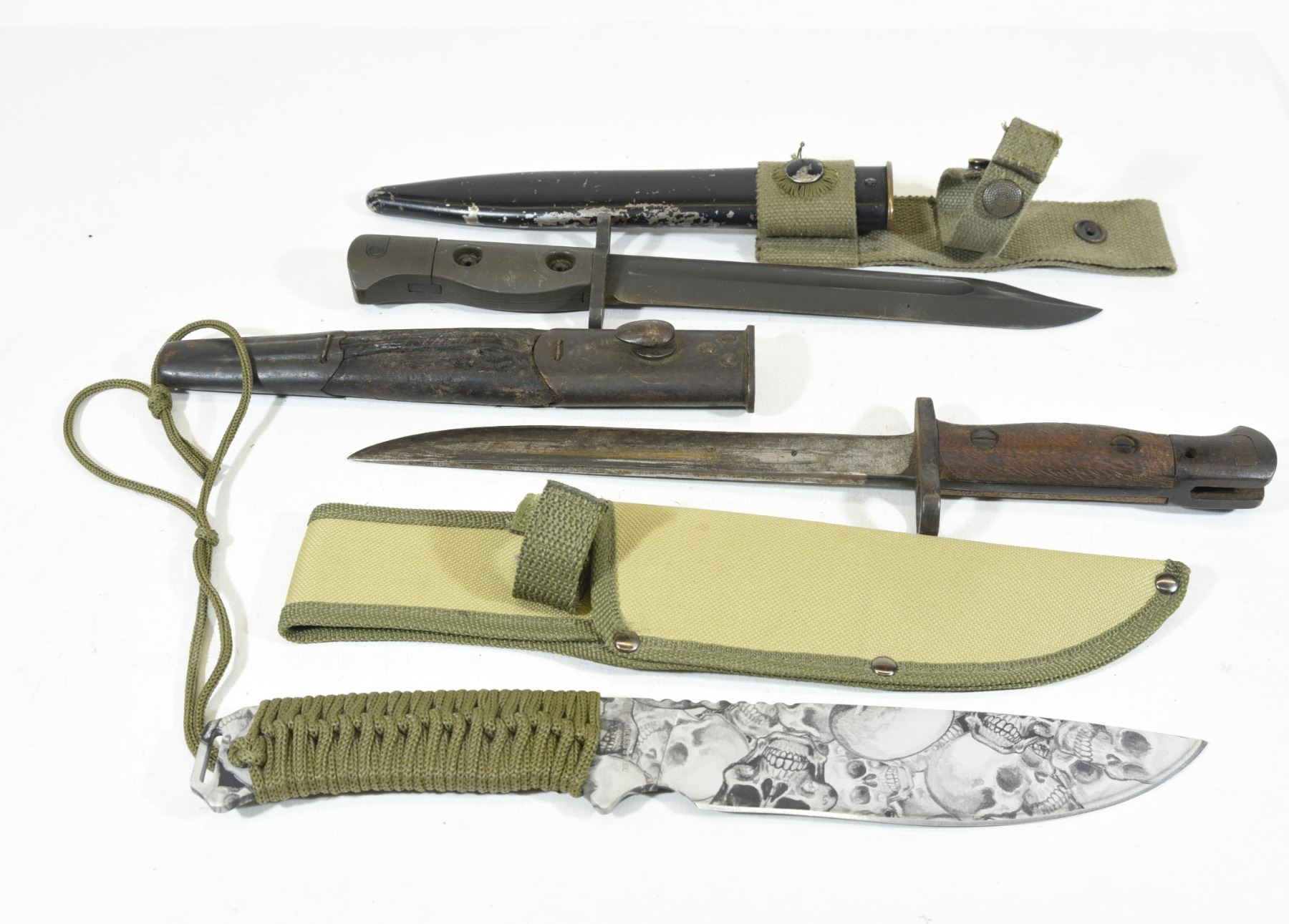 1) Unknown bayonet with markings ground off. Comes with sheath. 2) FN Fal bayonet in good condition with sheath and frog. 3) Unknown survival style knife, 6 1/2 " blade with a skull pattern, has a sheath.