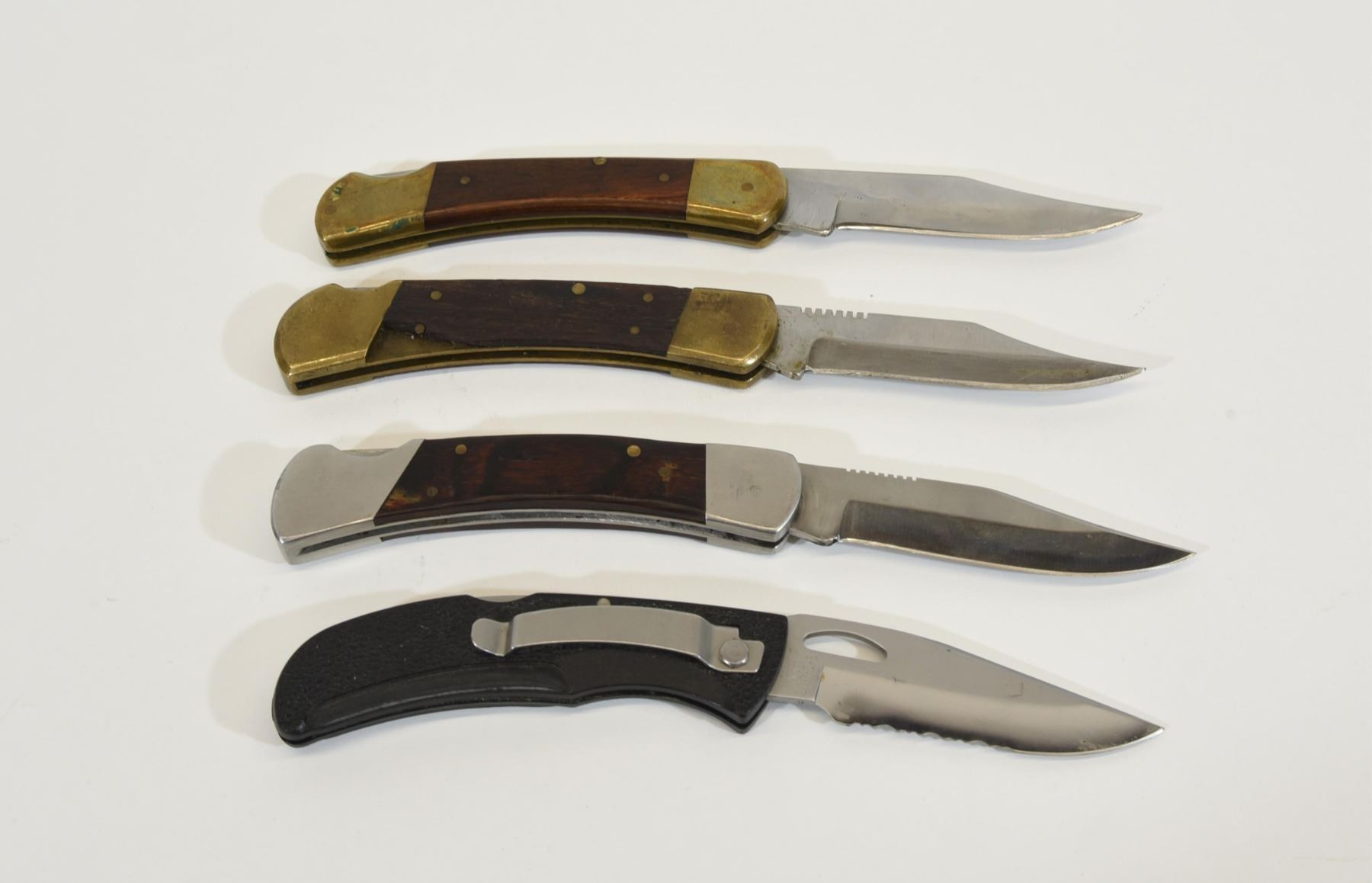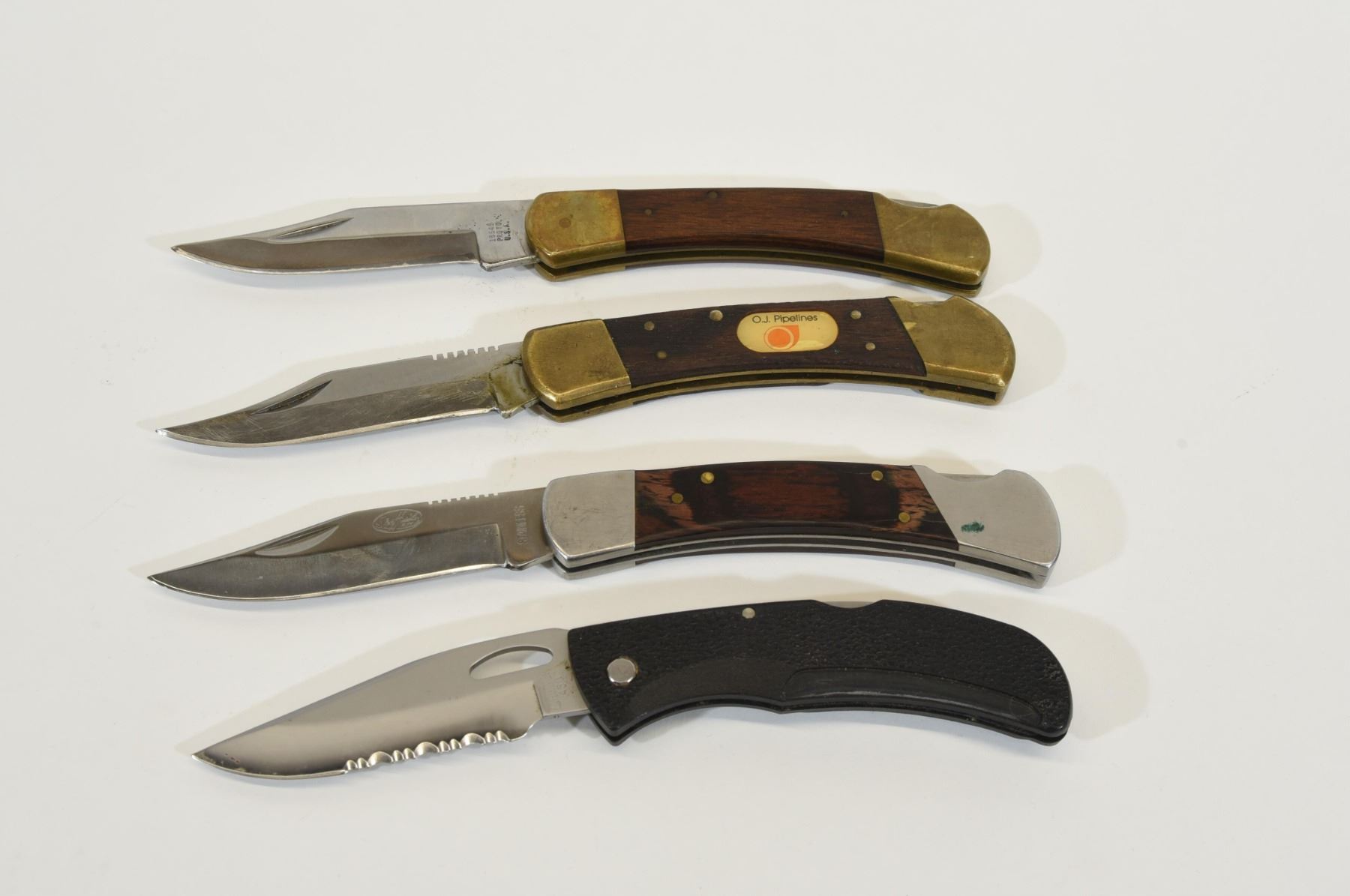 1) Sheffield lock blade, 4" blade with 2 small cracks in the handle. 2) Unknown 3 1/2" lock blade. Has 18545 Proto U.S.A. on the blade. 3) Unknown 3 1/2" lock blade, looks like a Sheffield, piece missing out of handle 4) Gerber 450,3 1/2" lock blade, has E-Z-OUT U.S.A. on blade, plastic handle