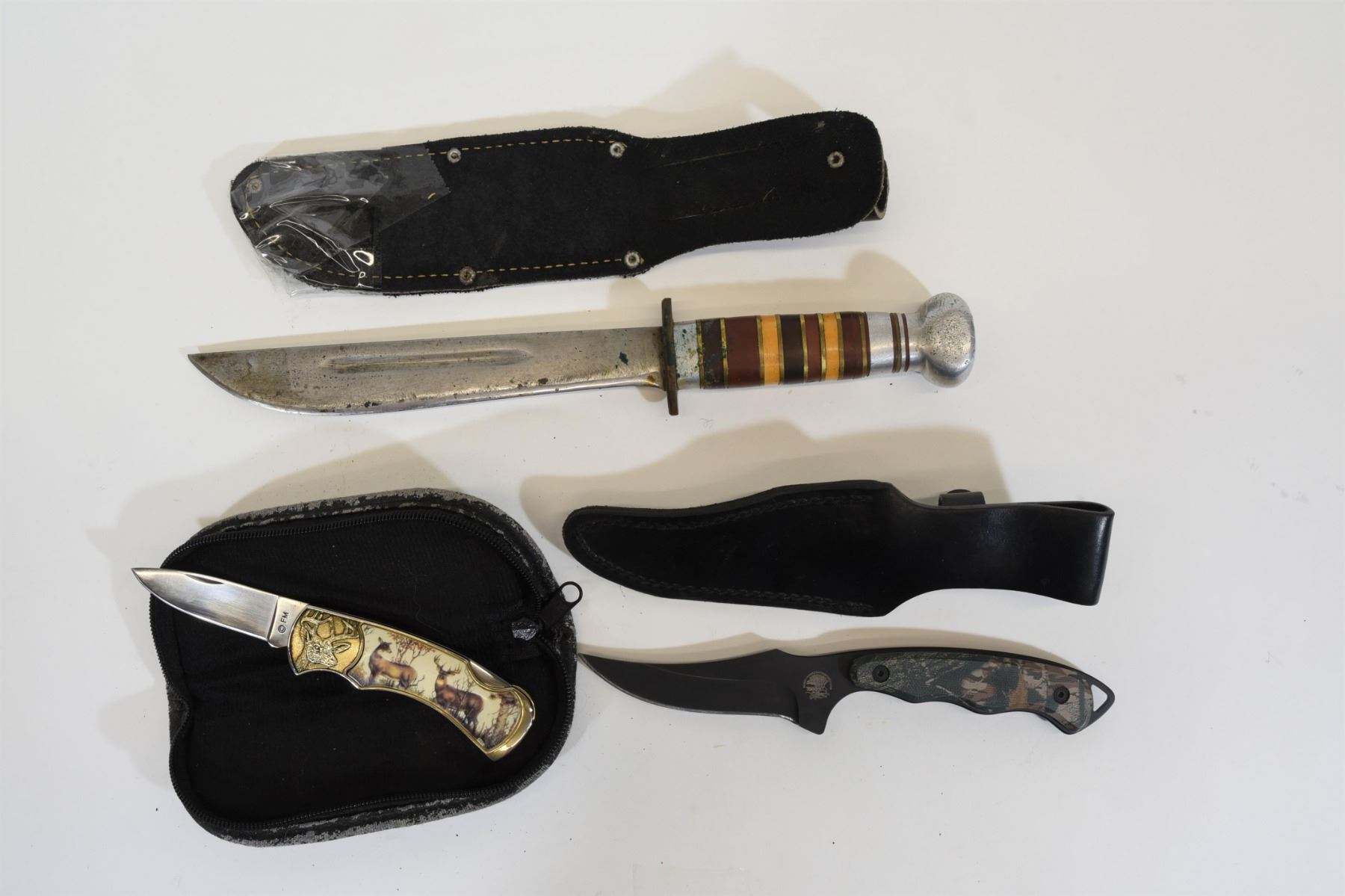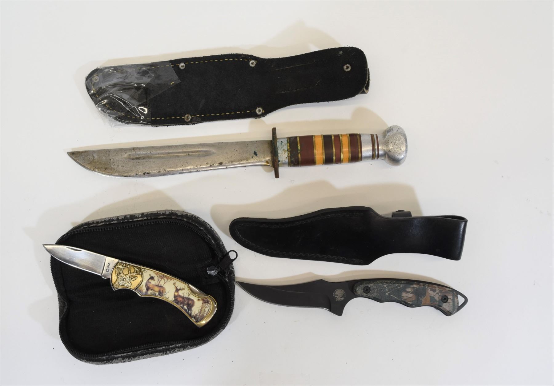 1) Franklin Mint 3" lock blade in very good condition. 2) Unknown hunting knife with 8" blade in fair condition. Stitching is loose on the sheath. 3) North American Hunting Club knife with 4 1/2" fixed blade, camo handle and cowhide sheath both in very good condition.