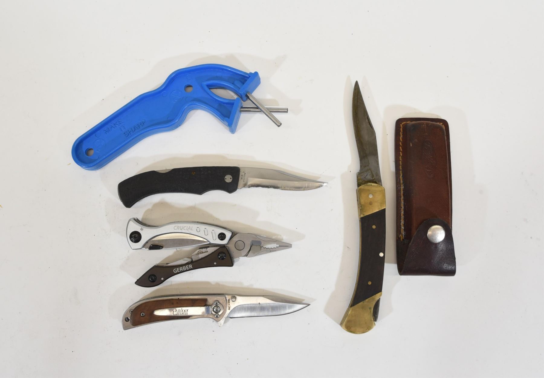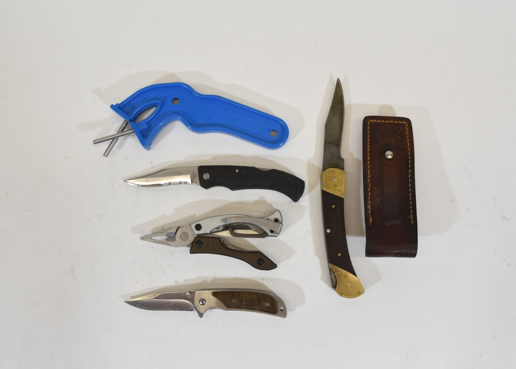 1) Outdoor Canada folding knife with 3" blade. 2) Vintage Sheffield lock blade with 3 1/2" blade and leather sheath which shows some wear. 3) Gerber 625 with 3" blade. 4) Gerber Crucial multi-tool. 5) Knife sharpener.