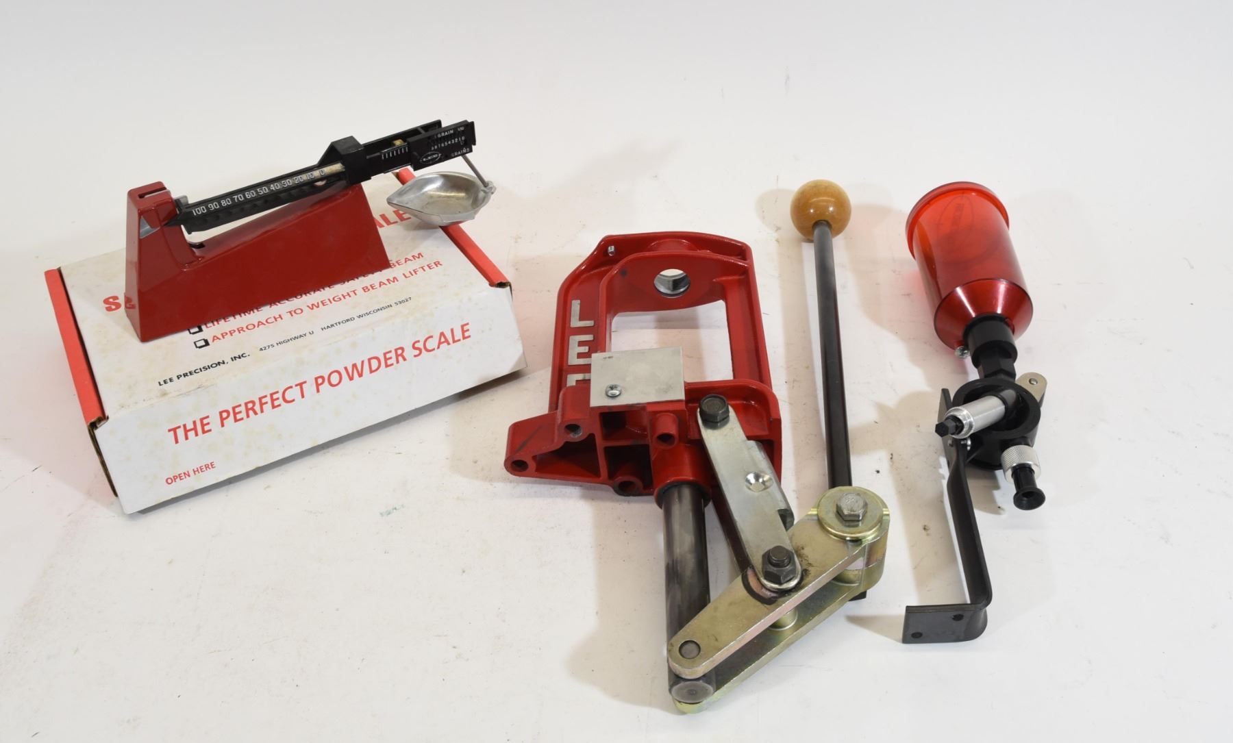1) Lee single stage press complete in very good condition. 2) Lee safety powder scale new in box.