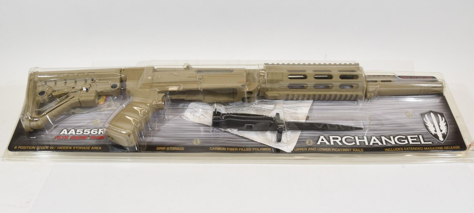 Fits Ruger� 10/22�. Mimics the look and feel of an M-4 flat-top carbine. Constructed of legendary high strength, carbon fiber and glass, and reinforced black polymer. Free floats any barrel contour including bull barrels up to .920" diameter. Ergonomic pistol grip with finger grooves. Two (2) secure storage compartments. Drop in fit*. Includes bayonet and is as new.