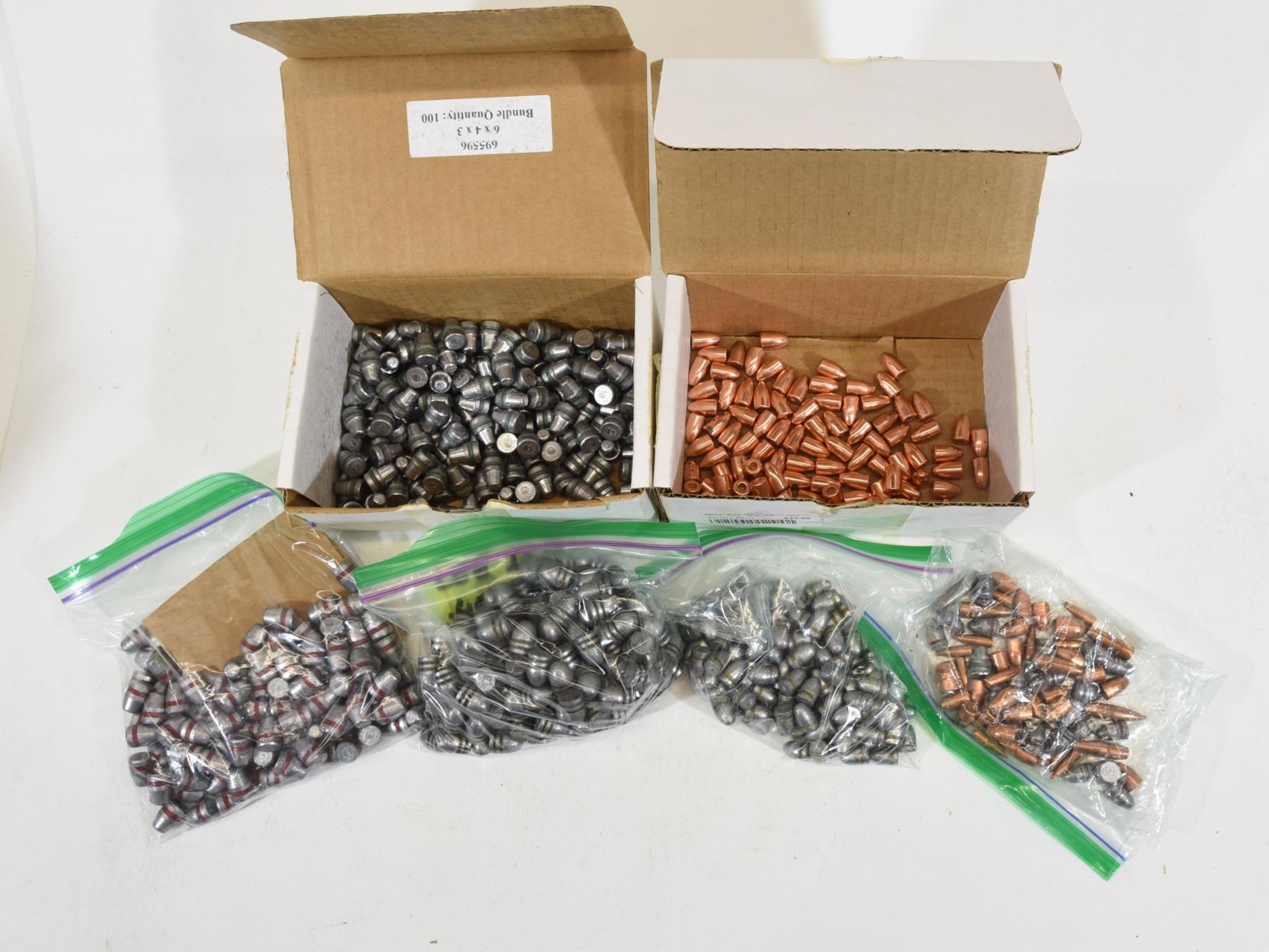 45 caliber - Wolf 200grn SWC (125 pieces), Lee 230grn RN (100 pieces), DRG 225grn FP (75 pieces) 9mm caliber - Wolf 125grn (50pieces) and 125 pieces of unknown.