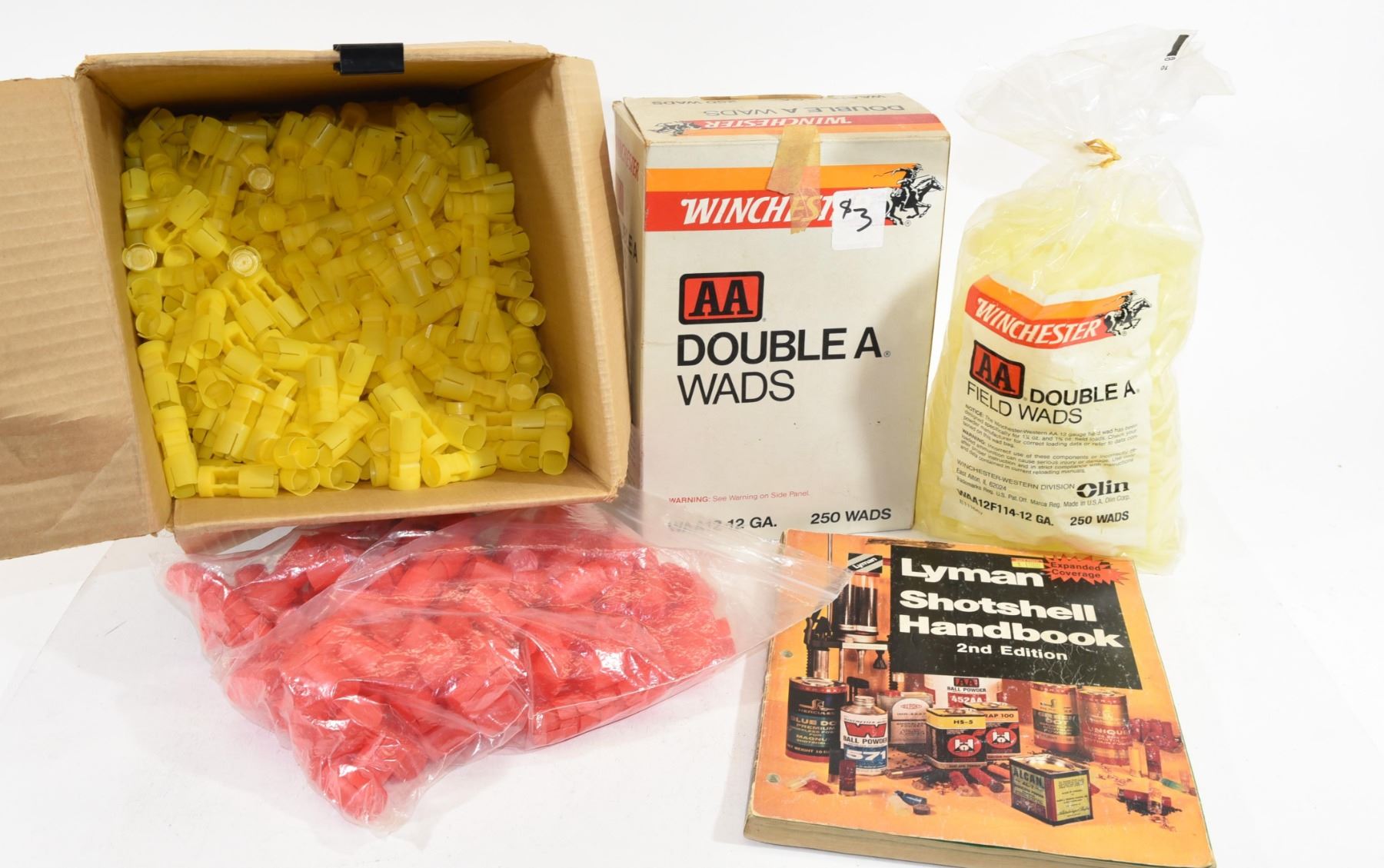1) 500 pulverize 12 gauge Winchester target wads. 2) 250 AA 1 1/4 wads. 3) 200 AA 12 gauge wads. 4) 150 steel cup wads. 5) Lyman shotshell manual