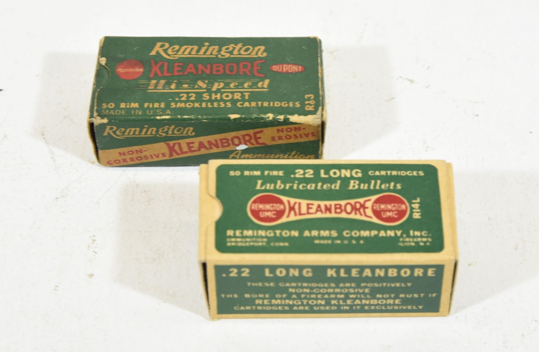 1) 50 rounds vintage UMC Kleanbore, 22 long. 2) 50 rounds vintage Kleanbore Hi - Speed, 22 short.