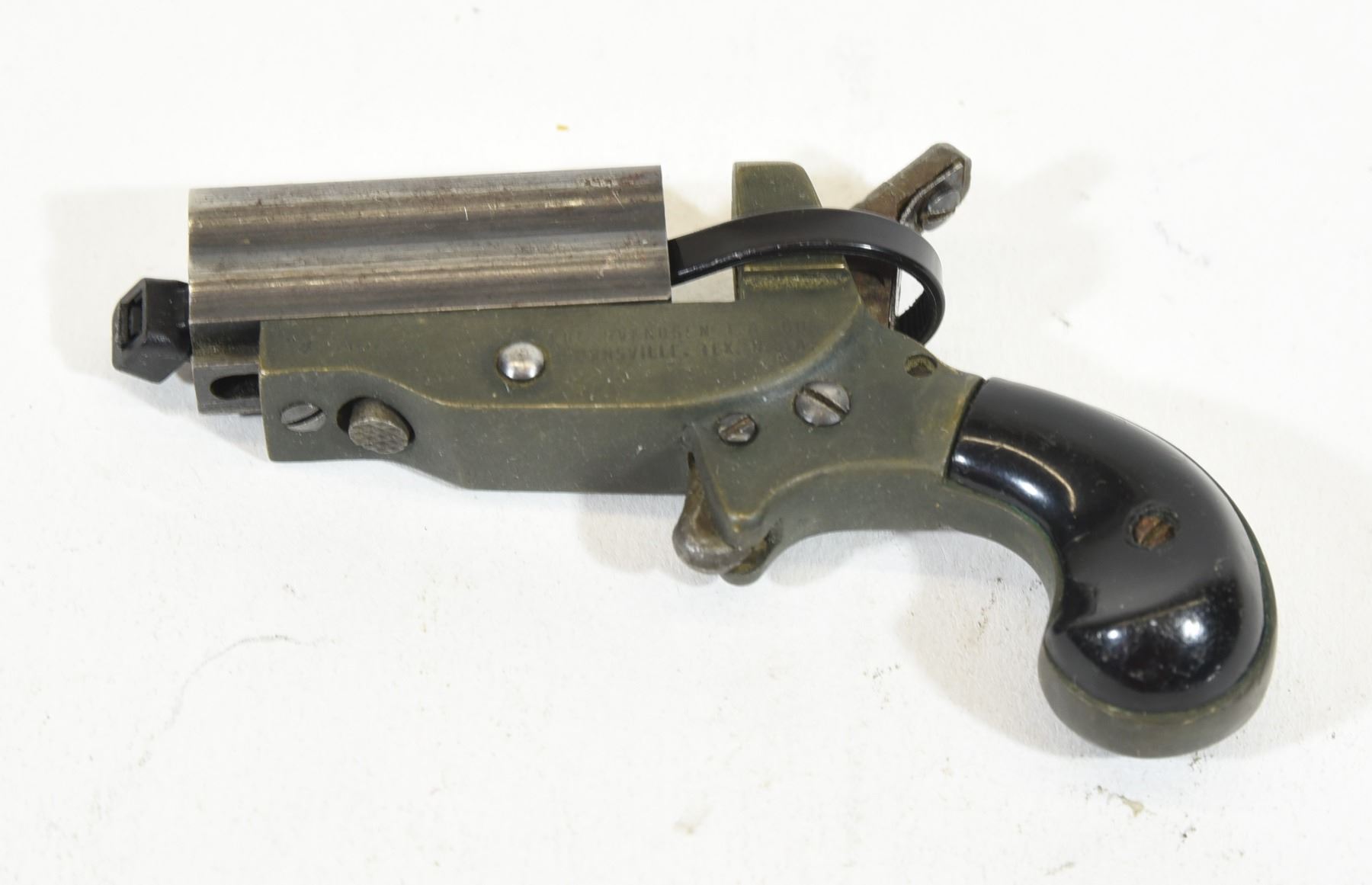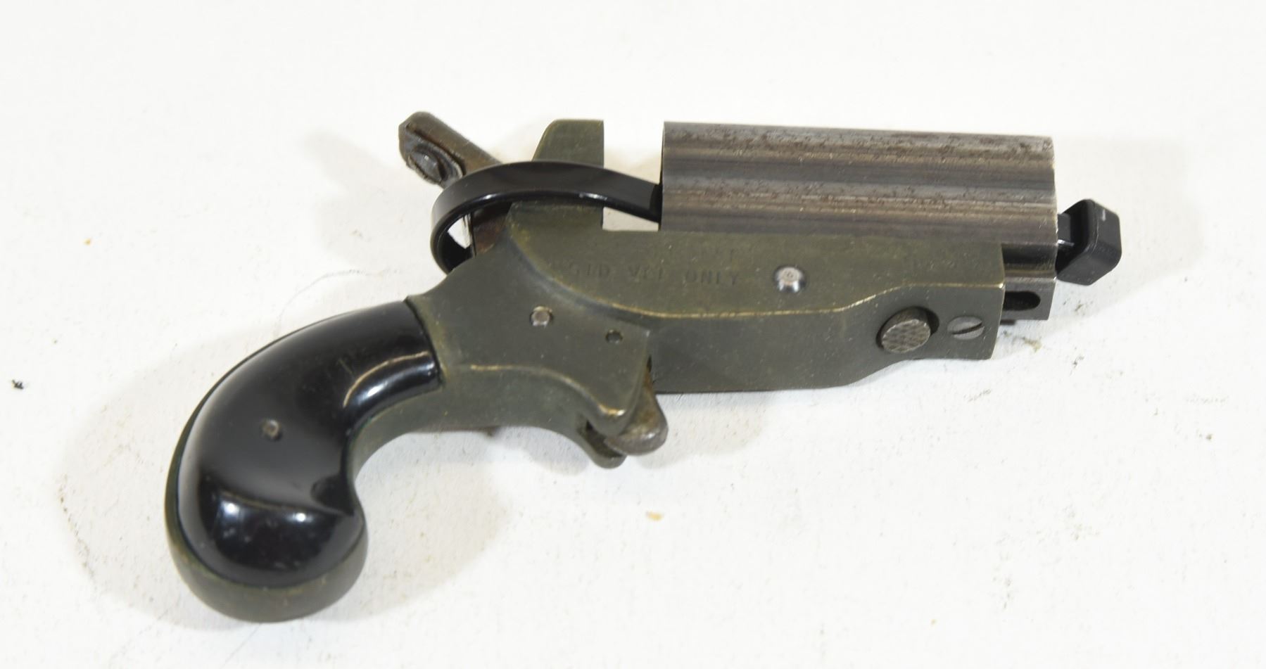 Prohibited, multi-barrel, 22 Short, 43mm barrel, SN 6244. Plastic grips have some marks, bluing worn off barrel, bores good. Needs parts to function.