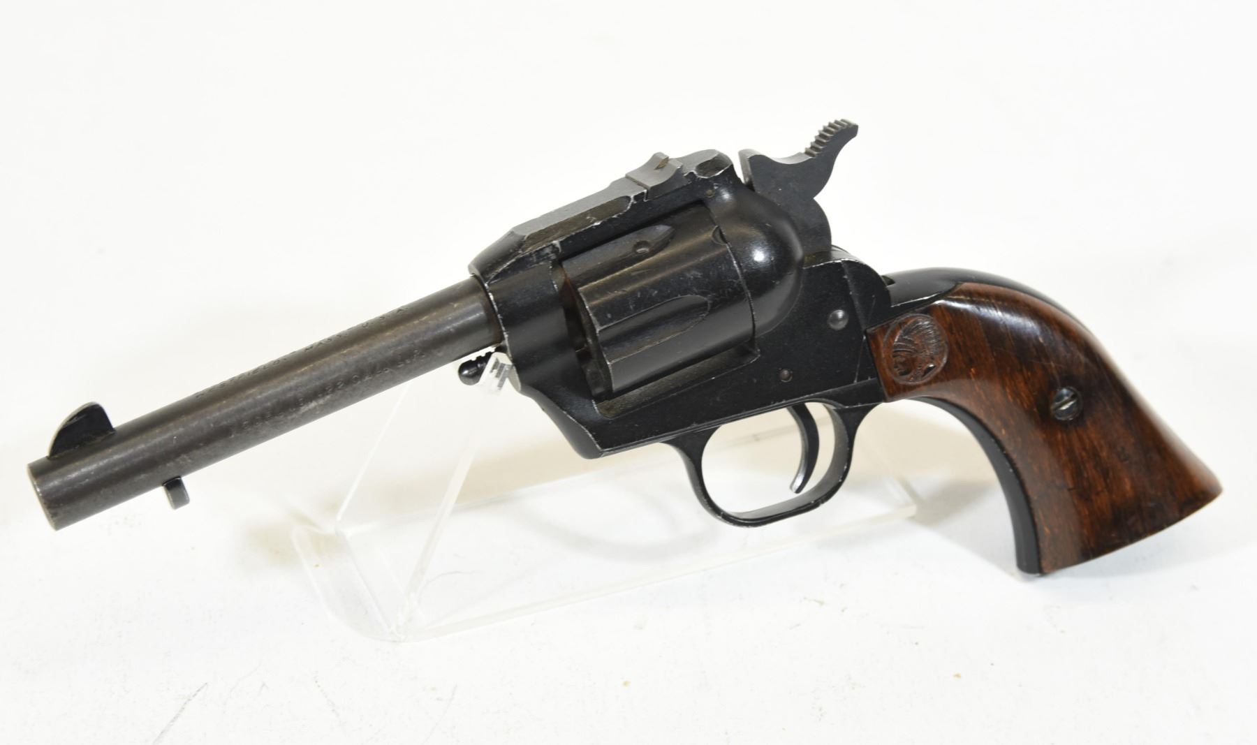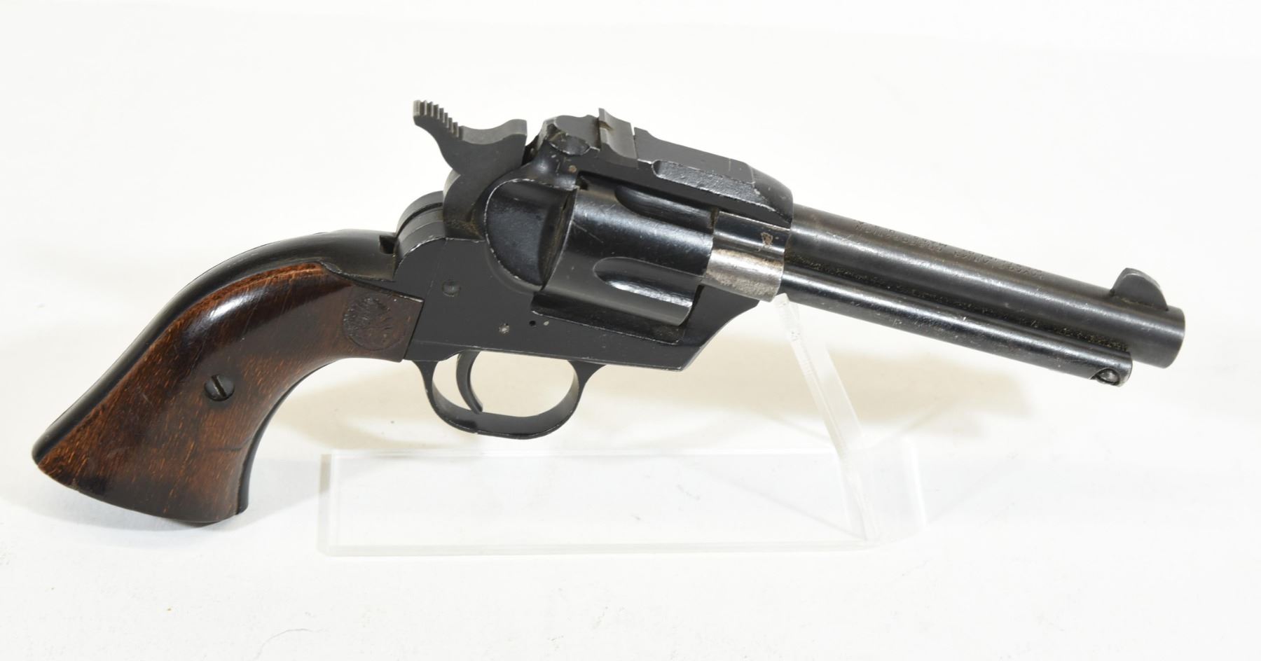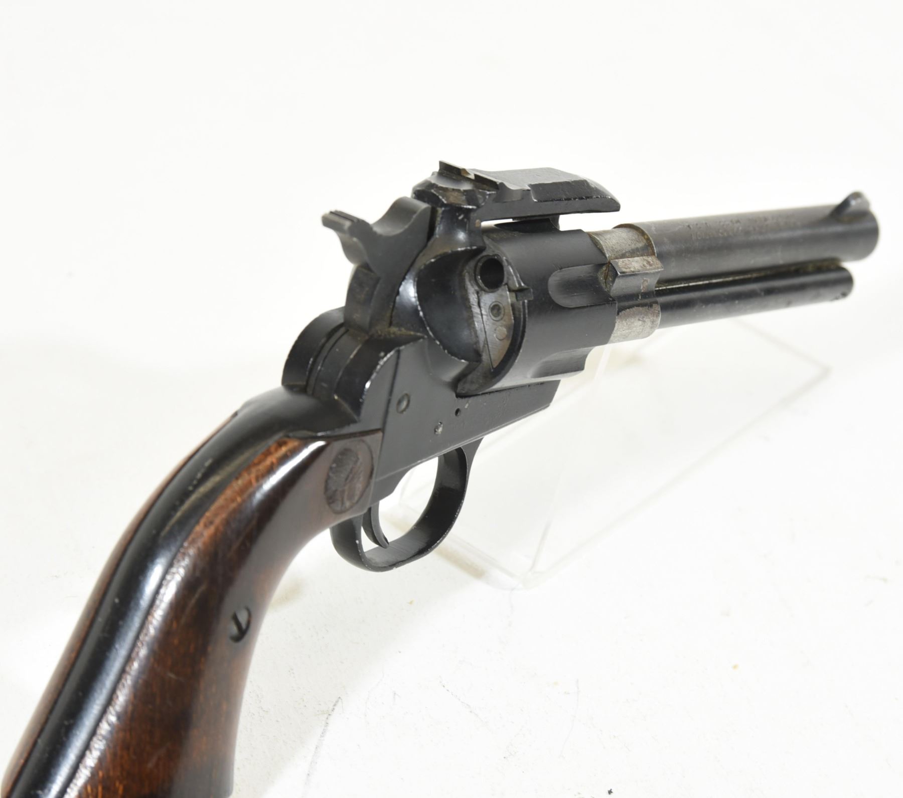 Restricted, single shot, 22 LR, 108mm barrel, SN 45843. Wood grips good, bluing grey on barrel scratches elsewhere, bore excellent.