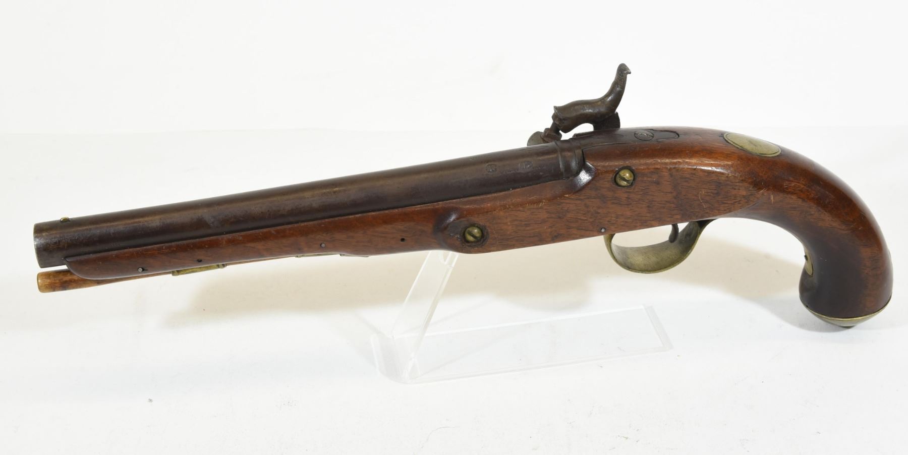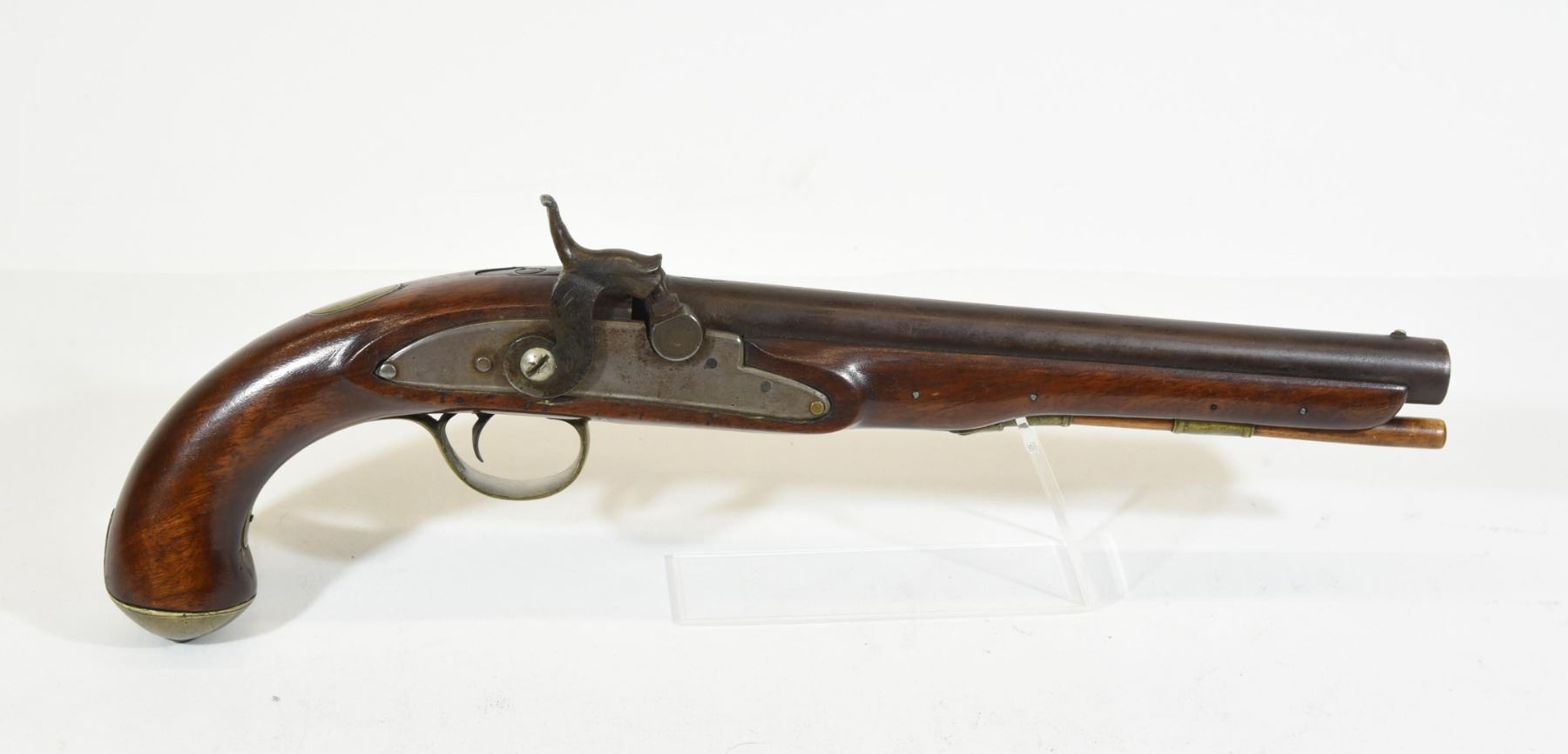 Antique, single shot, 56 percussion, 8 1/4" barrel, SN none. Wood has a chip and some scratches, bluing is brown, smooth bore pitted. Circa 1831. Firing mechanism works.