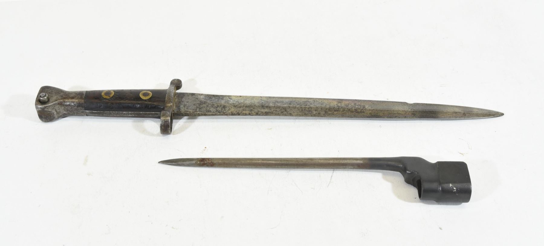 1) Enfield 1888 bayonet with a chip out of the blade. 2) Lee Enfield #4 MK2 spike bayonet.