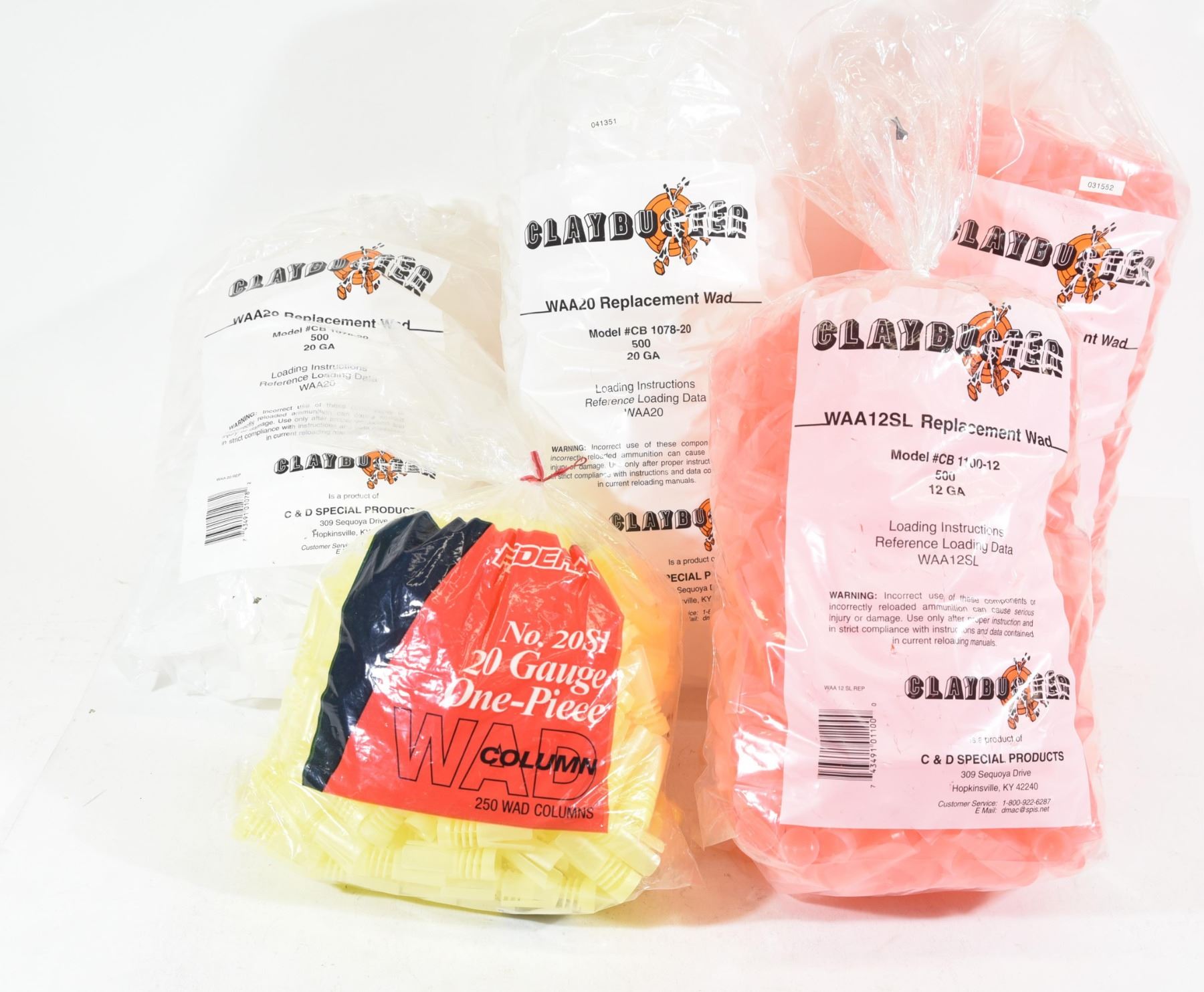 1) 1000 Claybuster WAA12SL wads. 2) 1000 Claybuster WAA20 wads 3) Partialy used bag of 250 Federal No. 20SI wads.