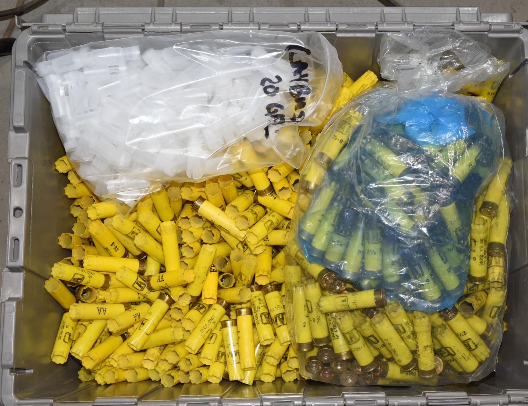 Grey bin 21" long x 15" wide x 12" high full of Winchester AA once fired hulls and a partial bag of wads. Will ship without the bin.