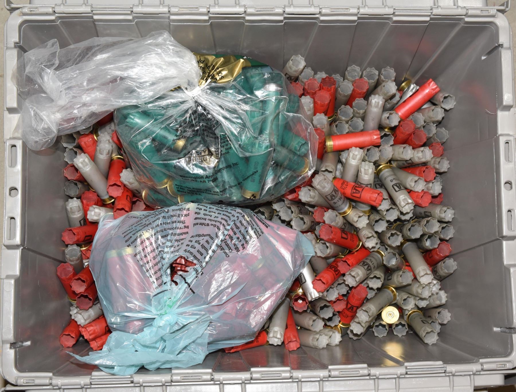 Grey bin 21" long x 15" wide x 12" high half full of AA and some Remington once fired shotshells.