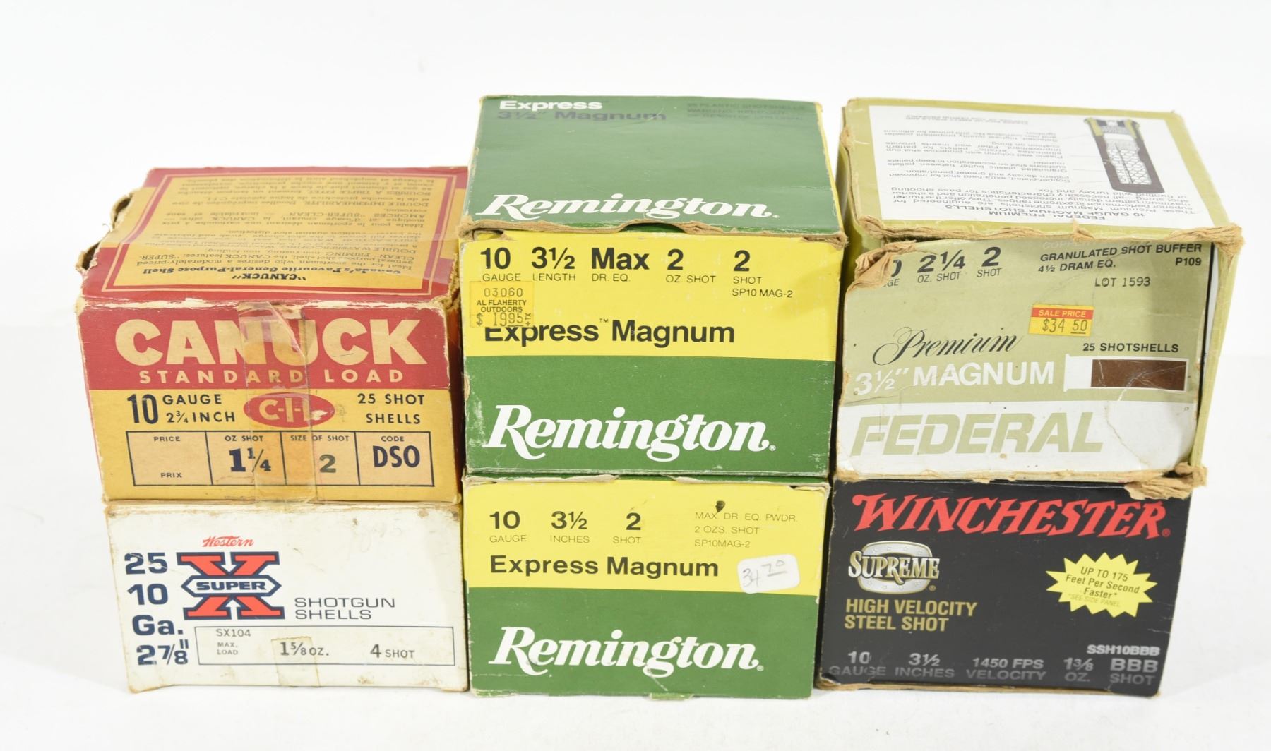 1) 18 rounds 2 3/4" #2 Canuck paper. 2) 24 rounds 2 7/8" #4 Western paper. 3) 55 rounds 3 1/2" #2 Remington & Federal. 4) 18 rounds 3 1/2" #BBB Winchester.