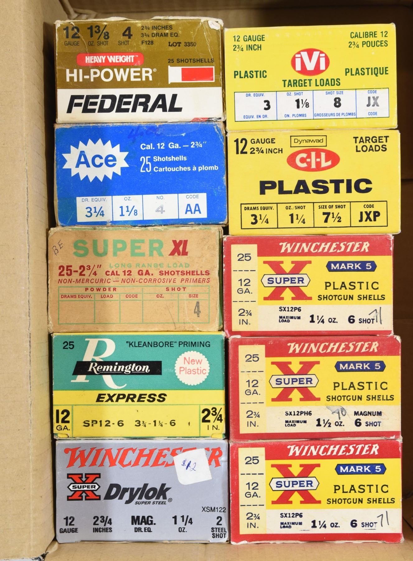 1) 75 rounds vintage Winchester SuperX #6 lead. Vintage boxes are in good plus condition. 2) 25 rounds lead mixed shot size. Vintage C-I-L box is in very good condition. 3) 25 rounds vintage iVi #8 lead, box is in good condition. 4) 125 rounds mixed manufacturers and shot size.
