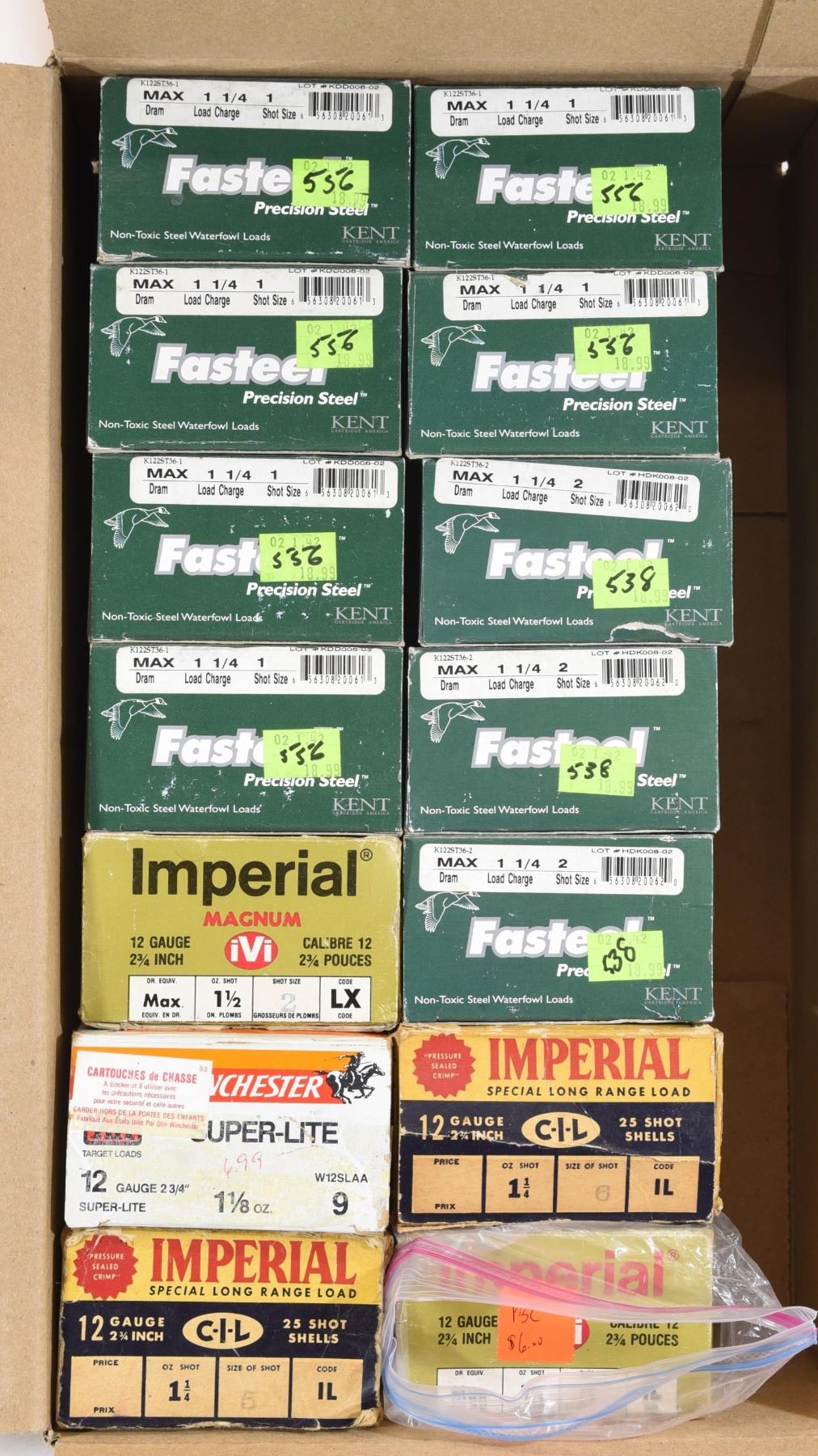 1) 150 rounds Kent Fasteel 2 3/4" #1 shot. 2) 150 rounds Kent Fasteel 2 3/4" #2 shot. 3) 50 rounds Imperial 2 3/4" #5 shot. 4) 25 rounds Imperial 2 3/4" #6 shot. 5. 25 rnds Imperial 2 3/4" #2 shot 6. 25 rnds Winchester 2 3/4" #9 shot boxes may not contain what they say.