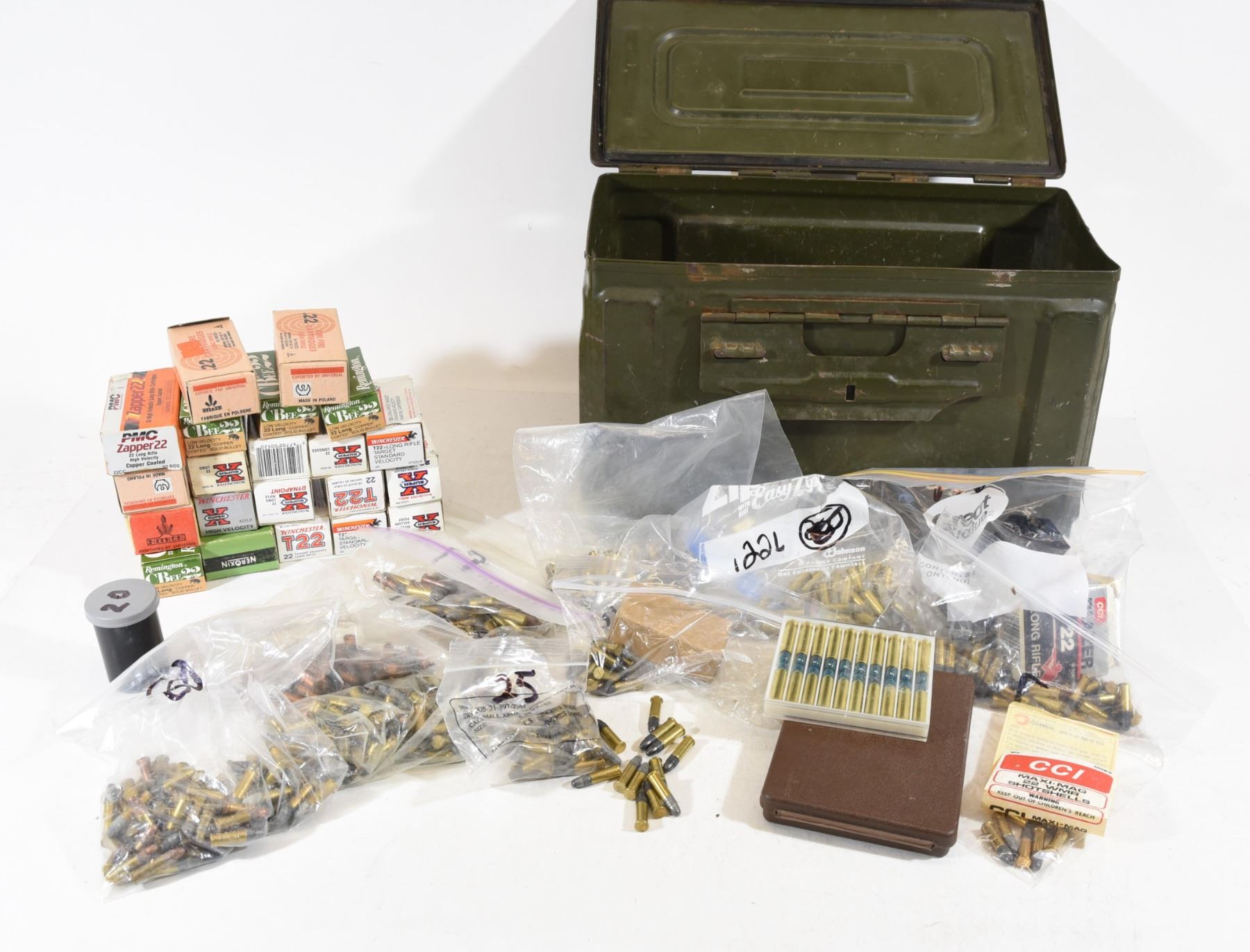 1) 250 rounds Remington CBee low velocity. 2) 200 rounds Polish 22. 3) 50 rounds PMC Zapper 22 4) 200 rounds Winchester T22 5. 100 rnds Winchester 29gr 6. 100 rnds Winchester 37gr 7. 100 rnds Winchester 40gr 8. 50 rnds Sellier & Bellot 9 20 rnds CCI 22WMR shotshells 10. 30 rnds CCI 22WMR 11. 559 rnds mixed 22 long and short.