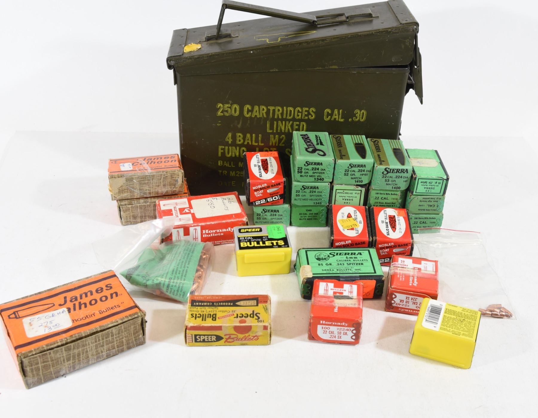 24.15 pounds including a metal ammunition can, various manufacturers over 90% .224 diameter.