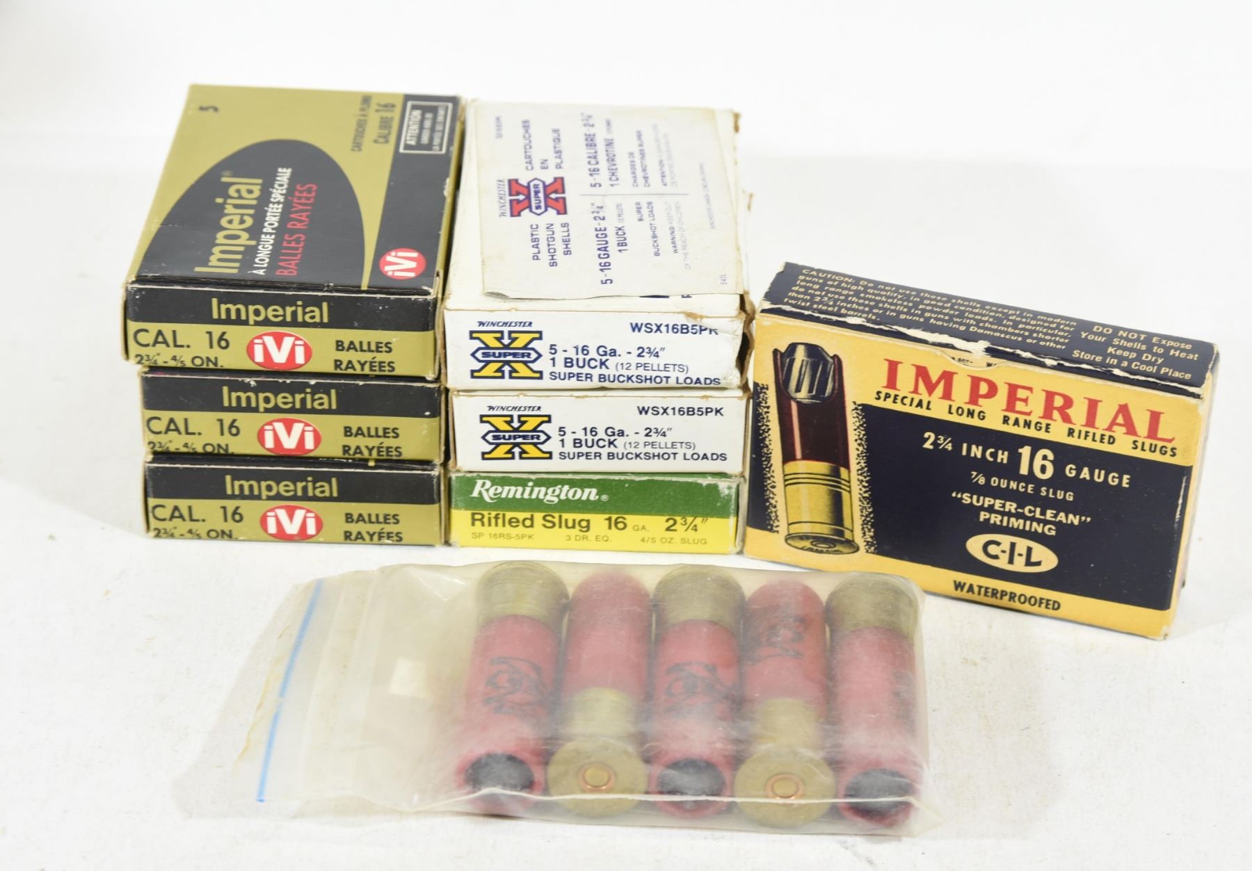 1) 23 rounds rifled slugs plastic shells. 2) 5 rounds vintage rifled slugs paper shells in a vintage Imperial box. 3) 7 rounds #1 buck plastic shells.