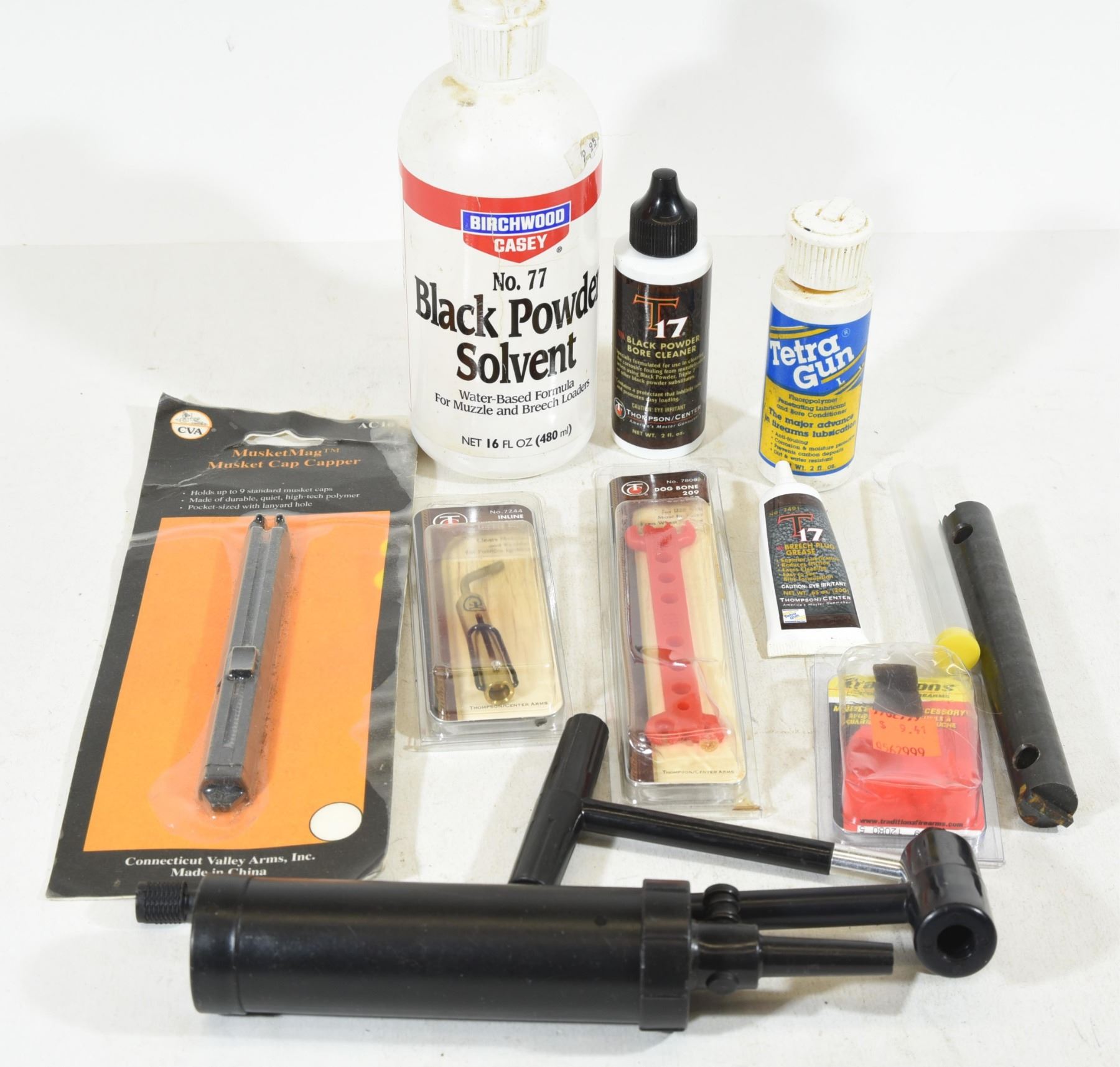 Traditions flint, dog bone capper, Musketmag, bullet starter, powder measure, jag, bore cleaner, lubricant, T17 grease, nipple pick, solvent, unknown breach plug tool.