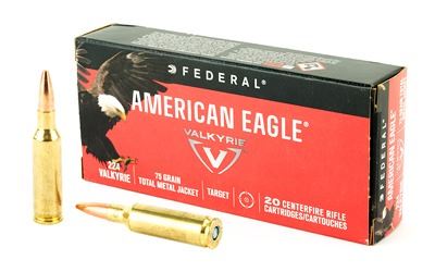 Train like never before with 224 Valkyrie and American Eagle rifle. The loads feature Federal(R) brass, clean-burning powder, consistent primers and accurate 75-grain TMJ bullets. They're the ultimate range ammunition for the ultimate MSR 15 cartridge.