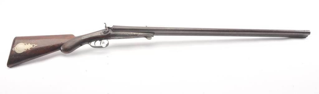 “W. Richards” marked cape gun or combo rifle shotgun with barrel marked “London” and silver inlays of star and arrow at the rear of the rib. Under lever release with set trigger also marked fine laminated steel.German silver disk type patch box in the buttstock. 2 leaf folding rear sight and blade front sight. W. Richards infringed on the reputation of Westley Richards of London but this gun is Belgian made and spuriouslymarked to be sold on foreign rural markets. Approximately 16 GA choked cylinder and approximately 10.11mm rifled barrel (Similar to .38-55 Win). A dent has been removed from right front of shotgun barrel. Fair to goodoverall used condition with patina finish. Sound mechanically and good lock up. Blackpowder era circa 1880s-90s. Favorite of German pioneers to South Africa. (Antique) Est.: $500-$1000