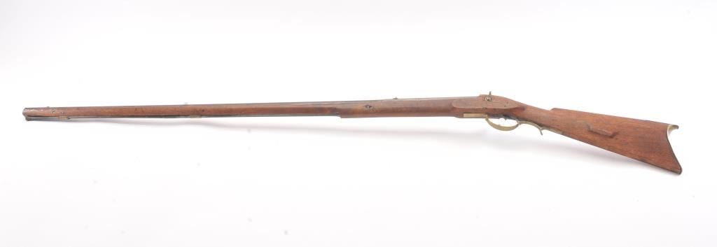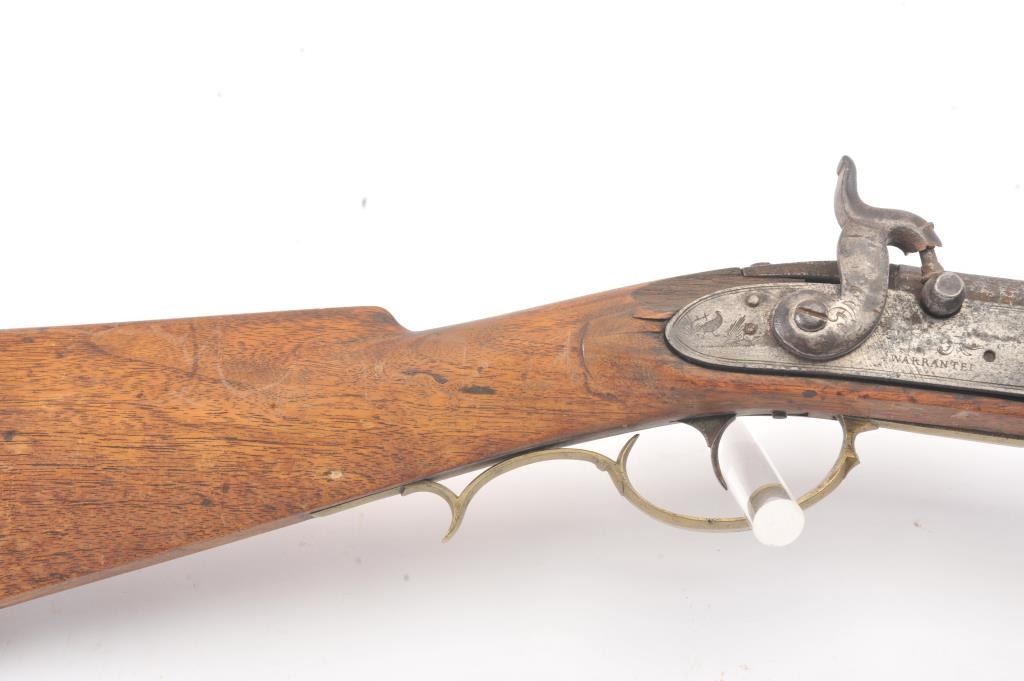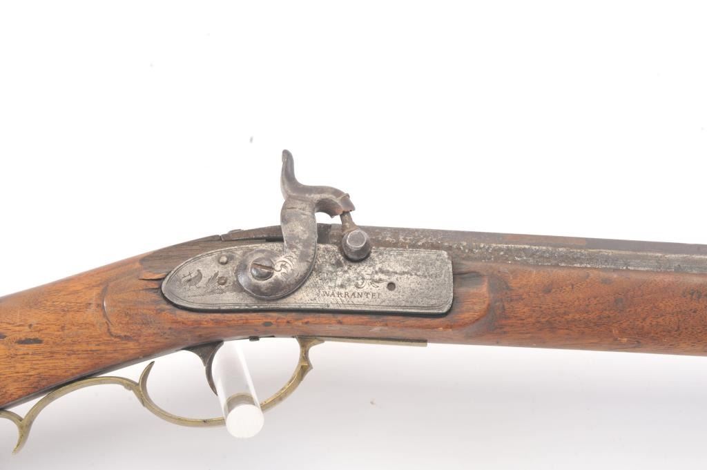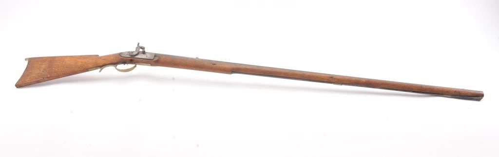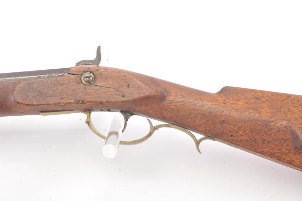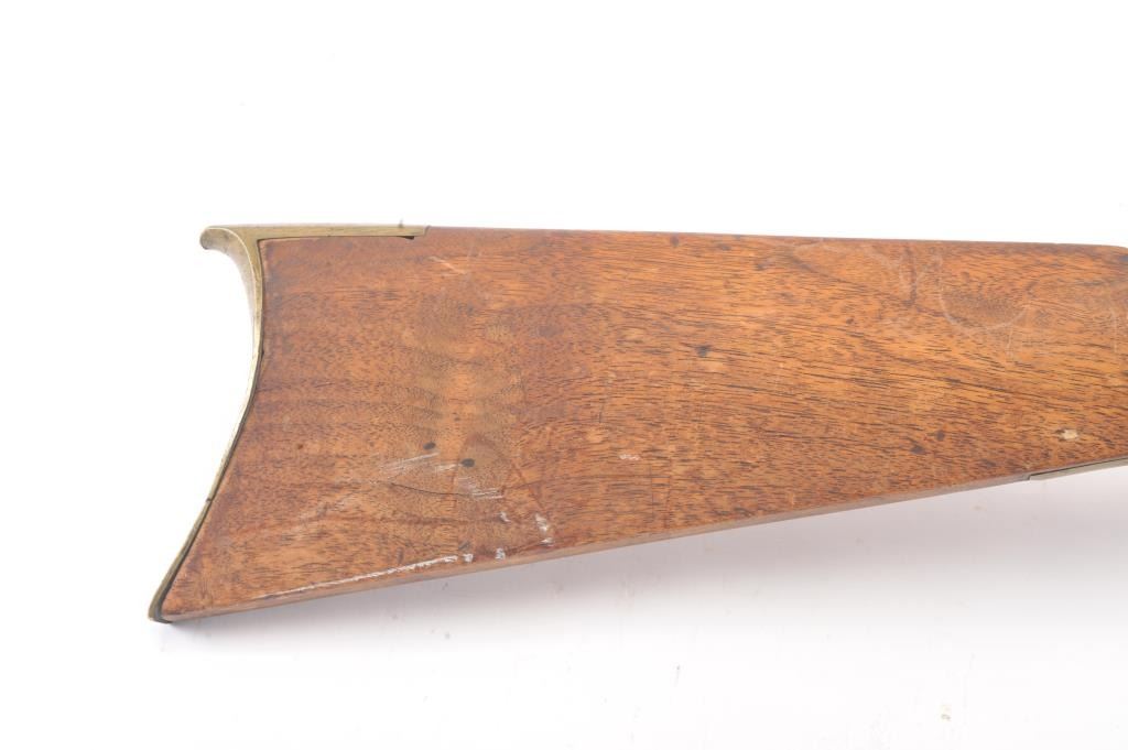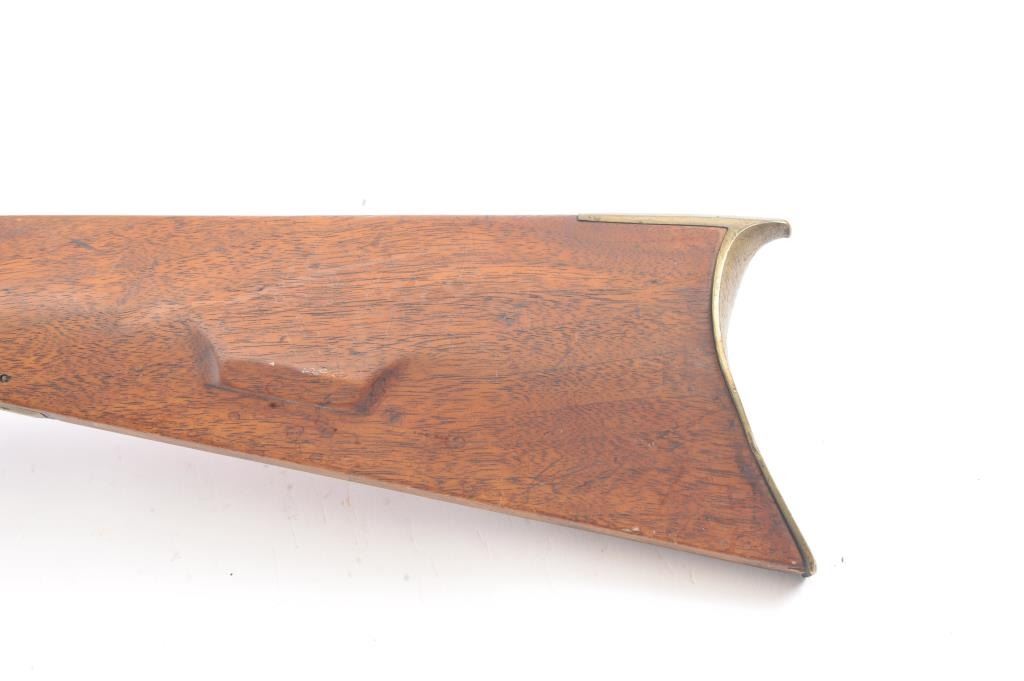 Full stock “Buck and Ball” percussion gun signed “Moll” old tag attached says “Old Charley”. First gun purchased by R.E. Hefner for his collection on 10-6-38 and bought from Charles Shriner who was born in Fiddletown,CA (Gold Rush area) in 1861. A copy of old newspaper article tells of Hefner’s collection featuring famous pioneer and gold rush arms purchased from original families starting in 1930s. Measures 58” overall witha 43” barrel in approximately .58-.60 caliber smoothbore. Gray/brown patina with some rust and erosion and scattered pitting in firing areas. The lock is marked “Warranted” and working. The wood is good other than largepiece missing behind the lock and extending beyond the lock (3” in length by ½”). Old metal ramrod. A California pioneer long arm with long provenance and fresh to the market. (Antique) Est.: $600-$1200