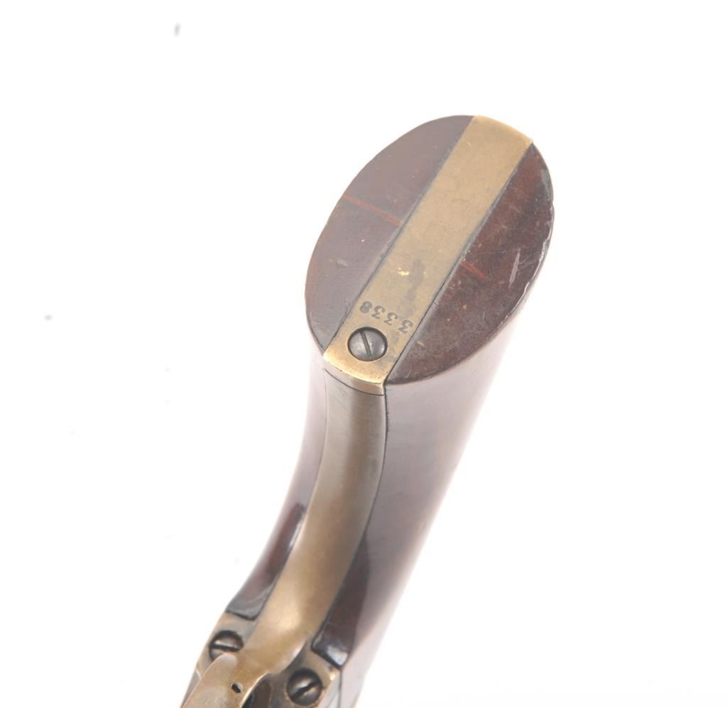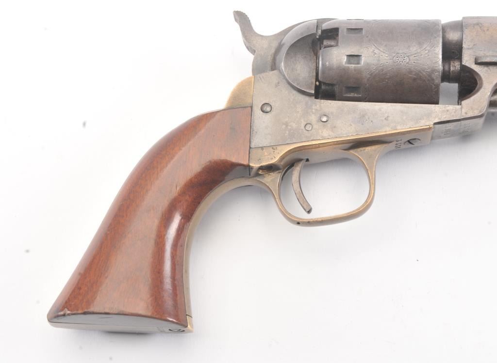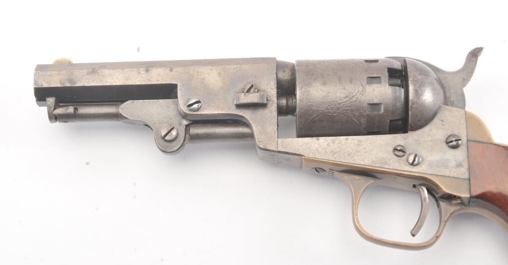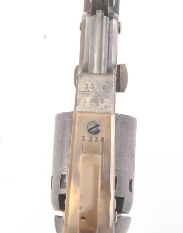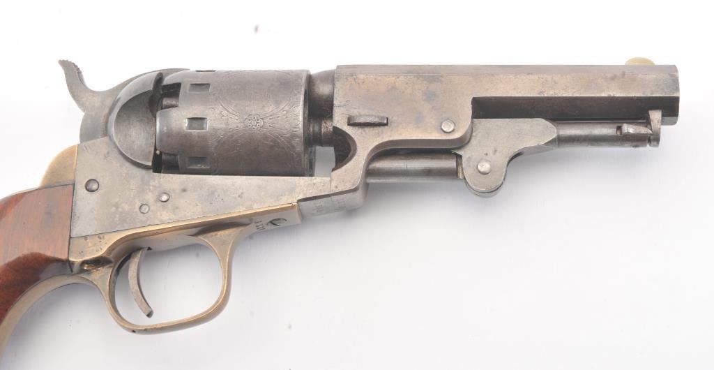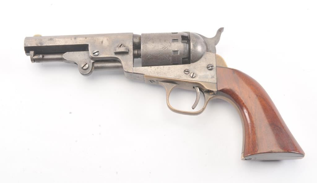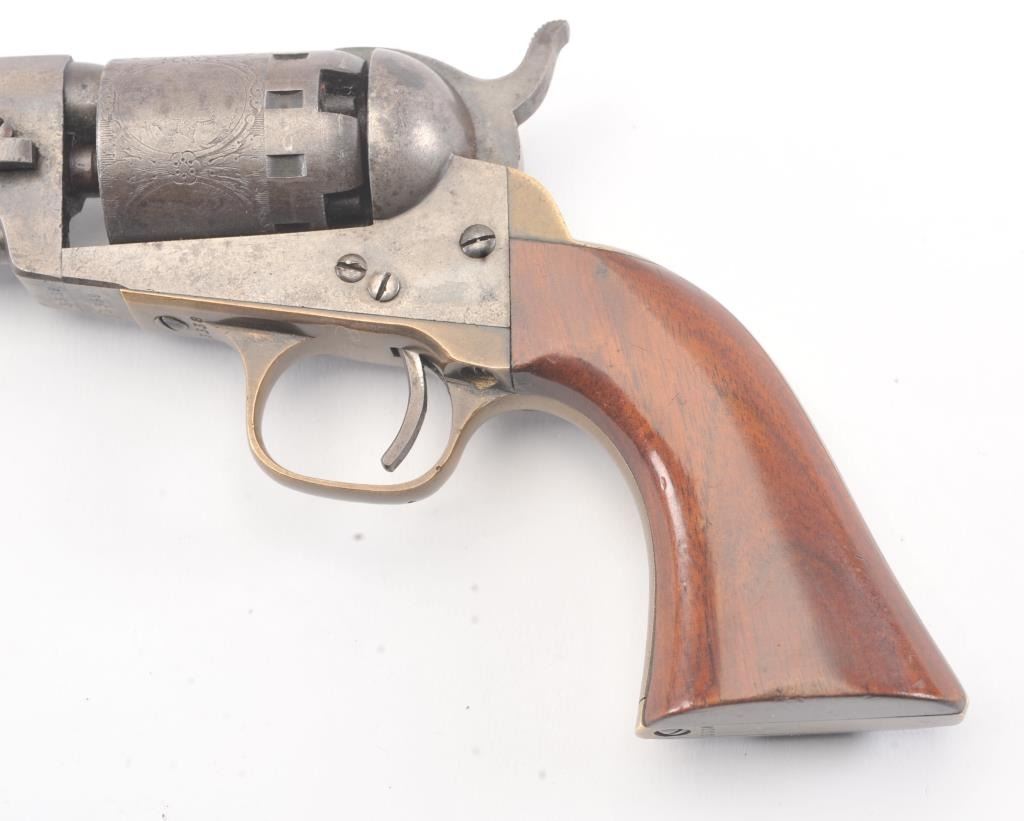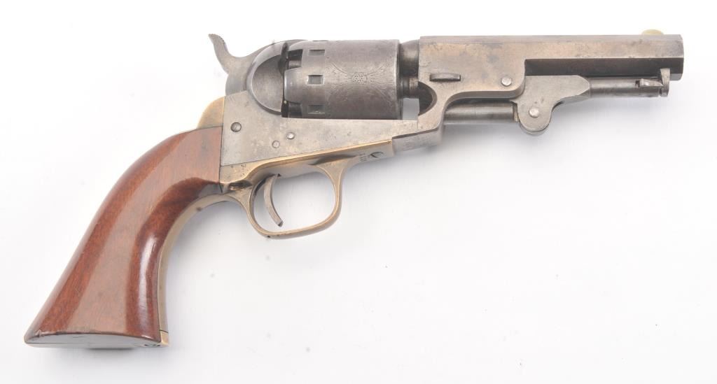Manhattan ,36 caliber Navy Revolver with a 4” barrel, blue and case hardened finish and varnished wood grips, S/N 3338. The cylinder retains 75%-85% original scene light in the central panels. 10%-30% blue and caseremaining with crisp metal and good markings. The grips are very good plus to almost fine and all matching numbers. An attractive Manhattan from the Civil War era. Excellent mechanically. (Antique) Est.: $700-$1400