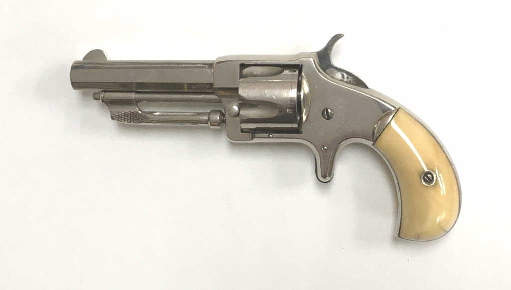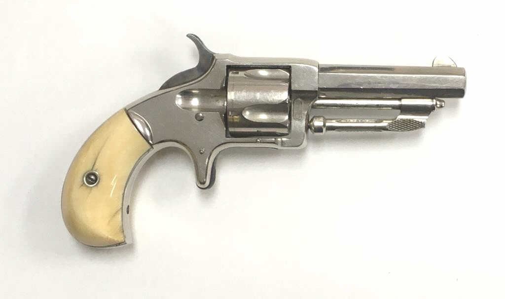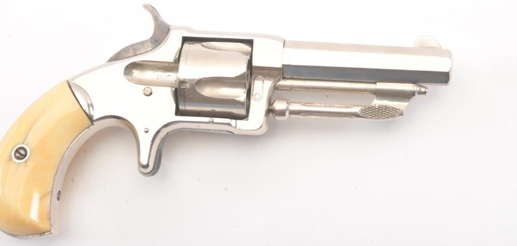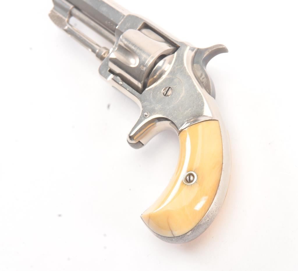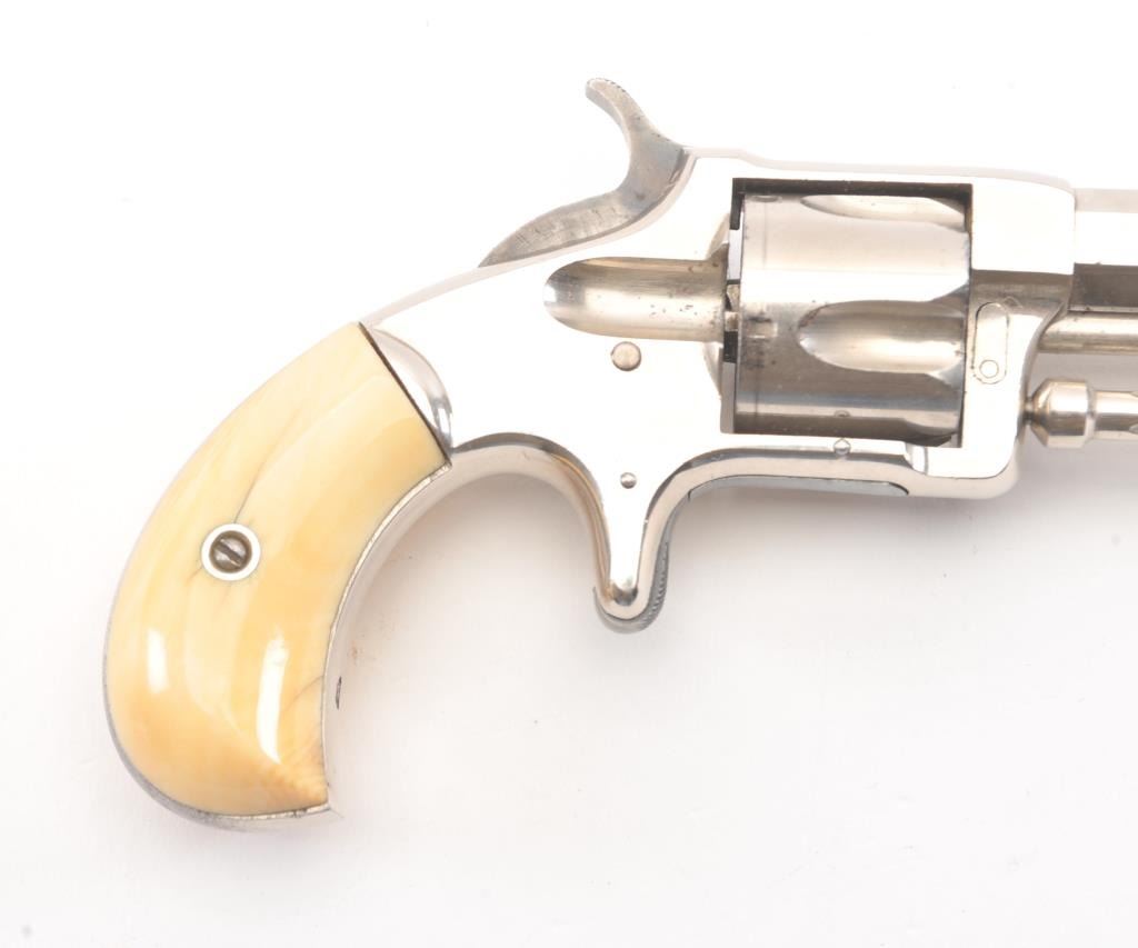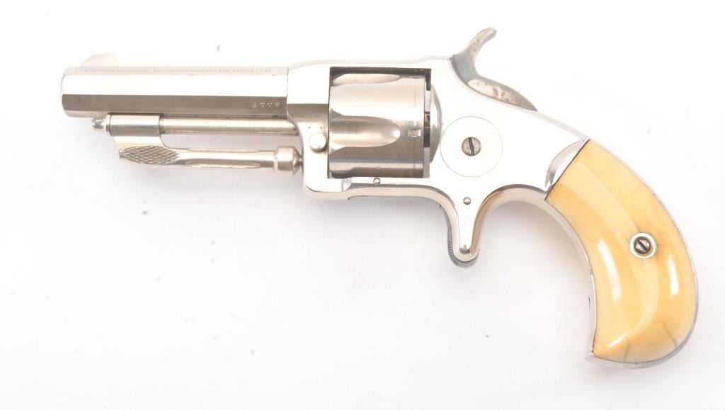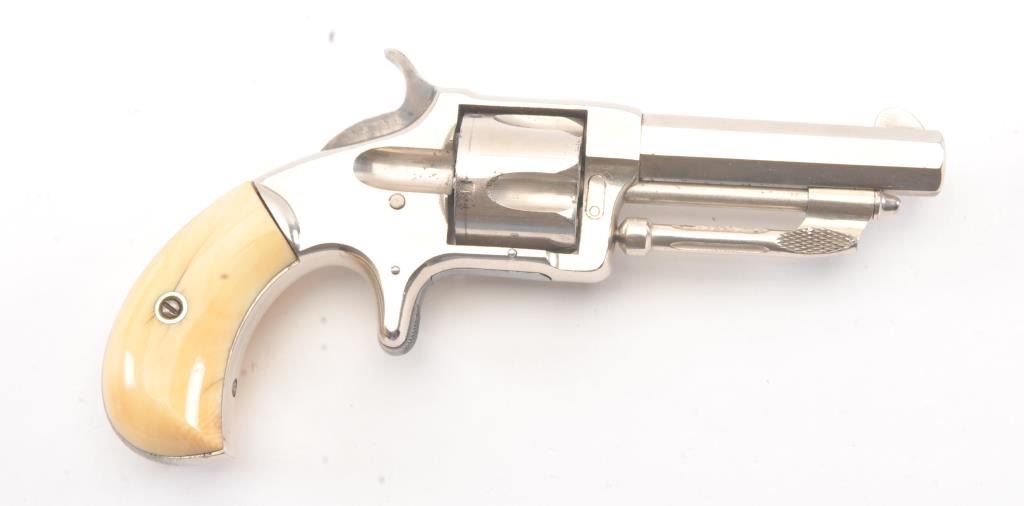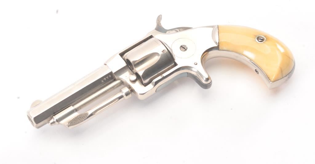 Wesson & Harrington Spur Trigger Revolver in .32 rim-fire with ivory grips and nickel plated, S/N 4779. 90%-95% original nickel with minor losses of finish on the back strap and butt. The grips show minor aging andyellowing and are authentic to the period of manufacture 1871-Mid 1870s. Crisp and sharp overall. (Antique) Est.: $600-$1200