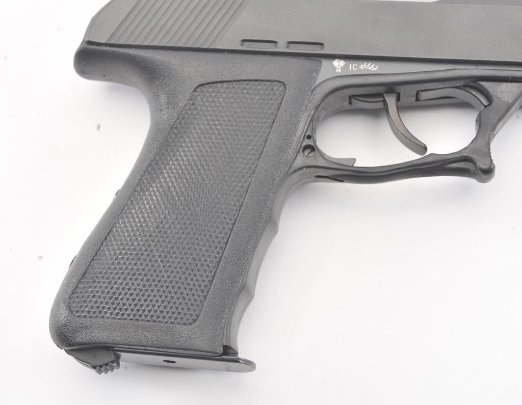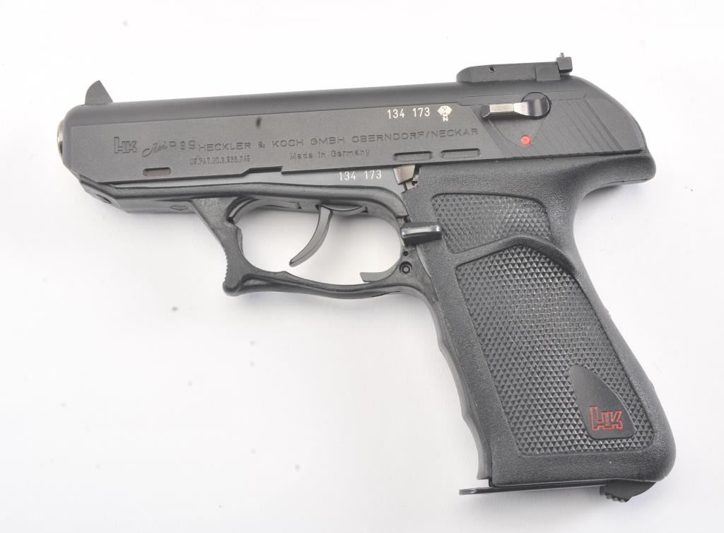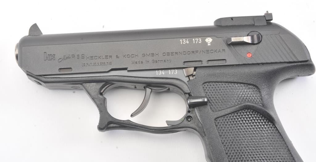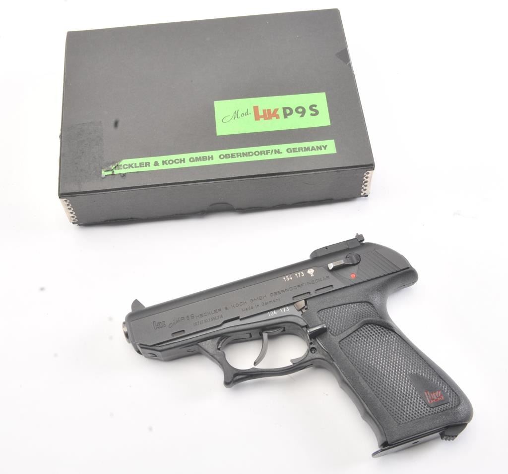 Desirable Heckler Koch P9S Target, #134173, 9mm cal., 4" stainless barrel, matte black finish, adjustable sights, black checkered logo grips. Pistol is in near excellent condition overall, showing 98%+ originalfinish, excellent grips and trigger guard. The paint on the front sight is vivid and intact. The bore is excellent, as is the action. Includes the original box, manual, test target, sight adjustment tool and fourcorrect magazines . (Modern/PPT) Est. $900-1800