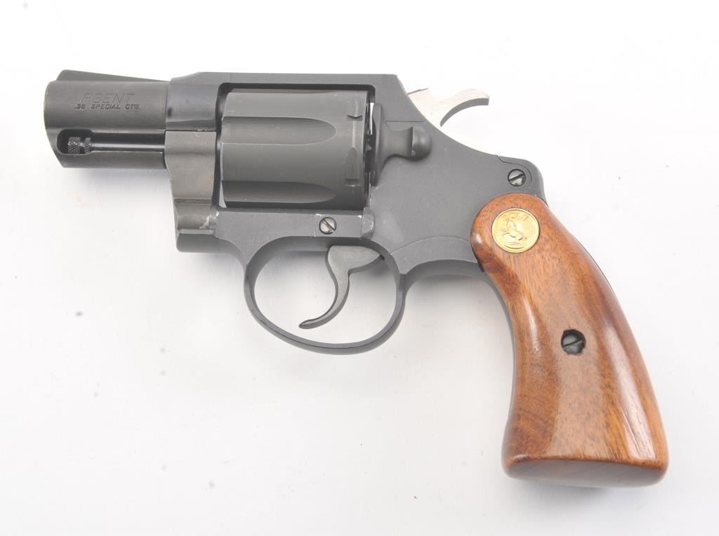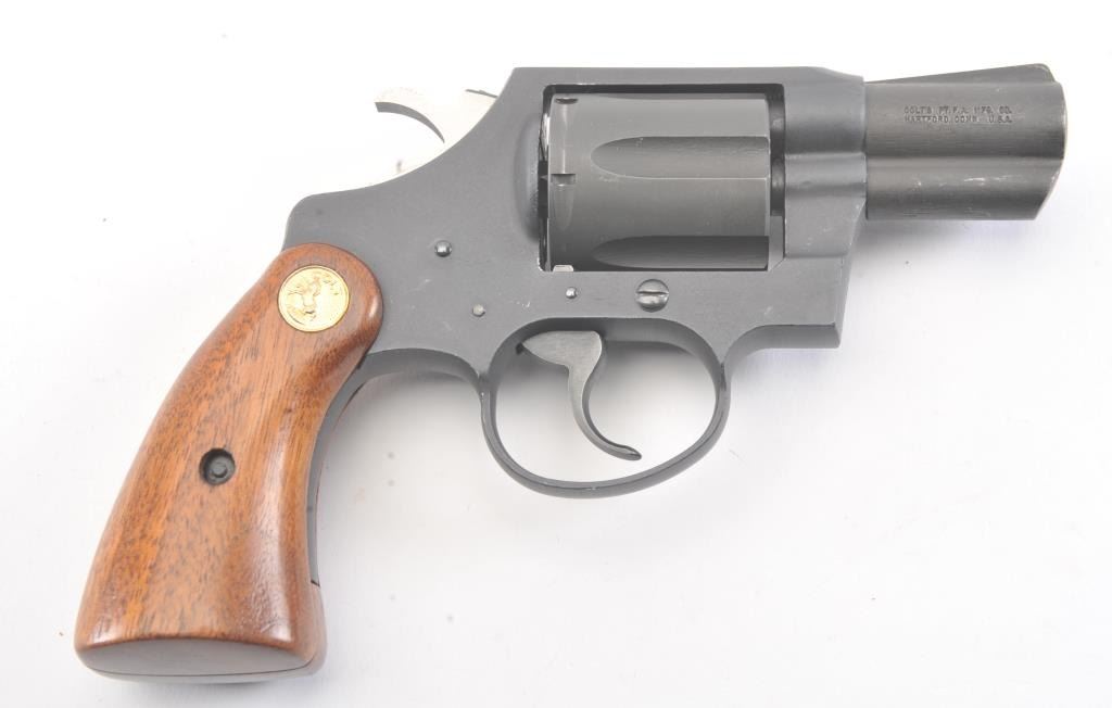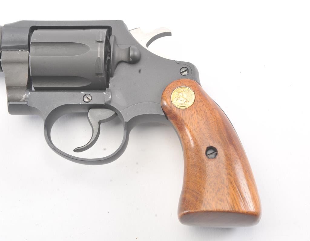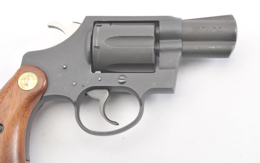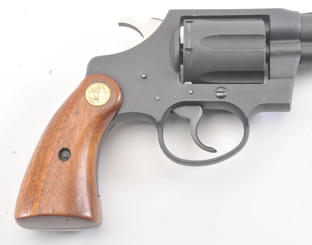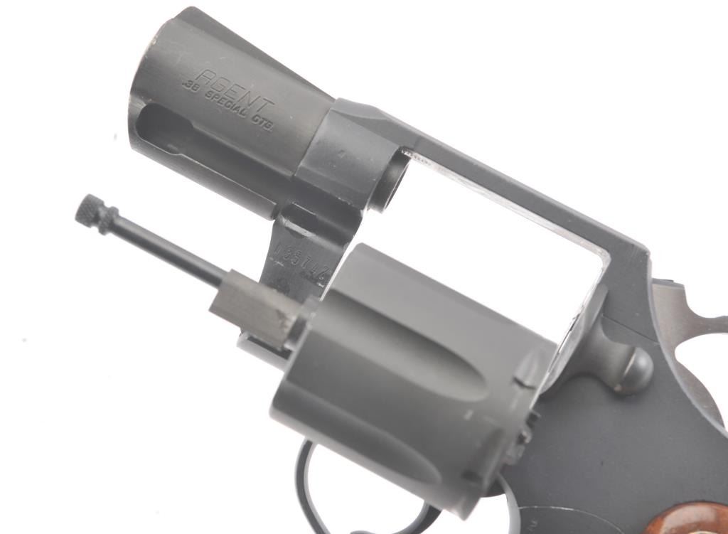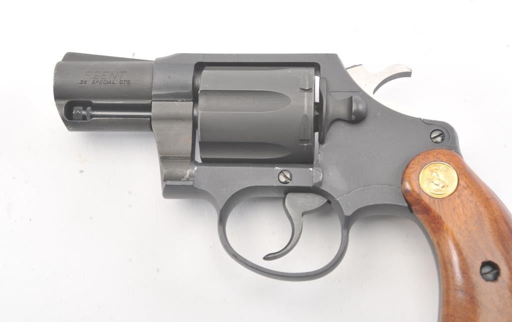 Scarce Colt Agent Double Action Revolver in .38 special caliber with a 2” barrel, military style finish, and medallion wood grips, S/N W35742. Near fine used condition. 95%-98% overall. Minor use and handling. Made for a relatively short period of time. 1955-1972 and discontinued. (Modern/PPT) Est.: $500-$1000