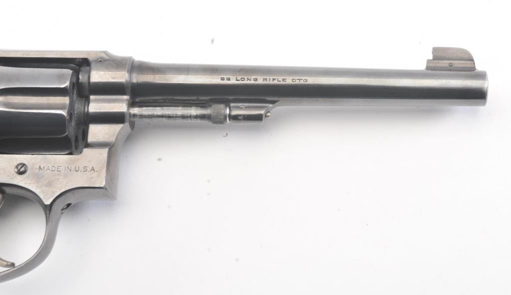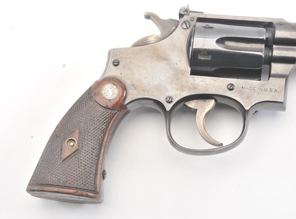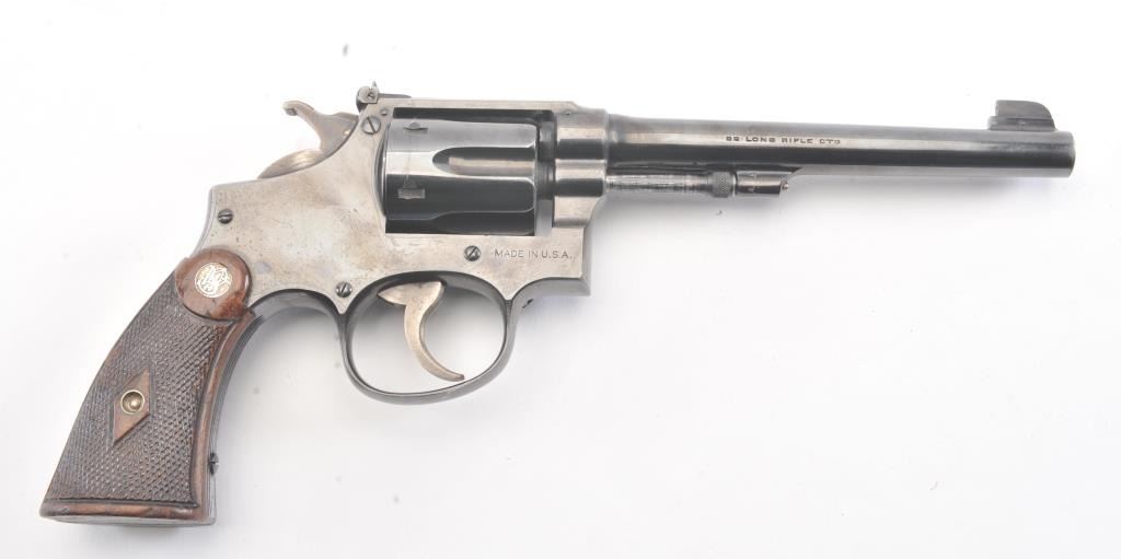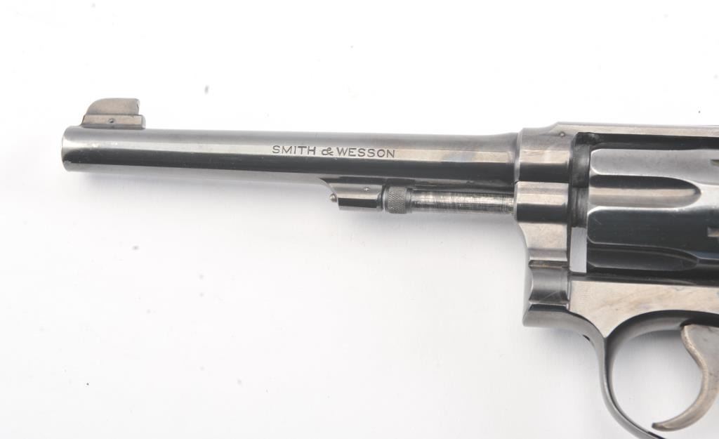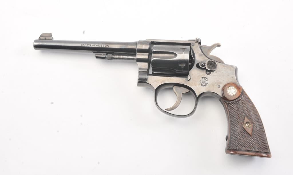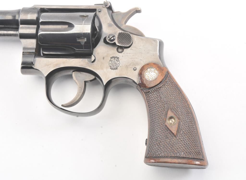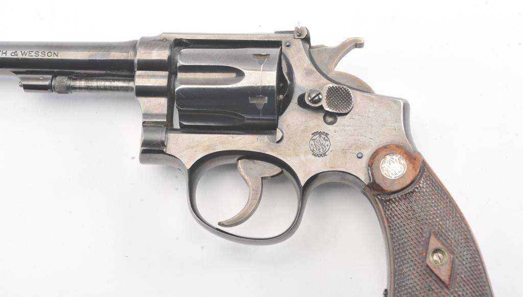 S&W K-22 5 Screw Double Action Target Pistol with a 6” barrel, S/N 7867. 75%-85% bright original finish with some streaking on the right side of the frame over the logo otherwise even loss on high points and edges. Minor index line on the cylinder. Good and bright bore. The grips are good to very good with matching use and minor wear other than bottom on the butt where they have been cleaned or reduced slightly and a name hasbeen removed from the butt not professionally. The action is good and the bore is bright. 60%+ case colors on the hammer and the trigger. (C&R/No PPT) Est.: $500-$1000