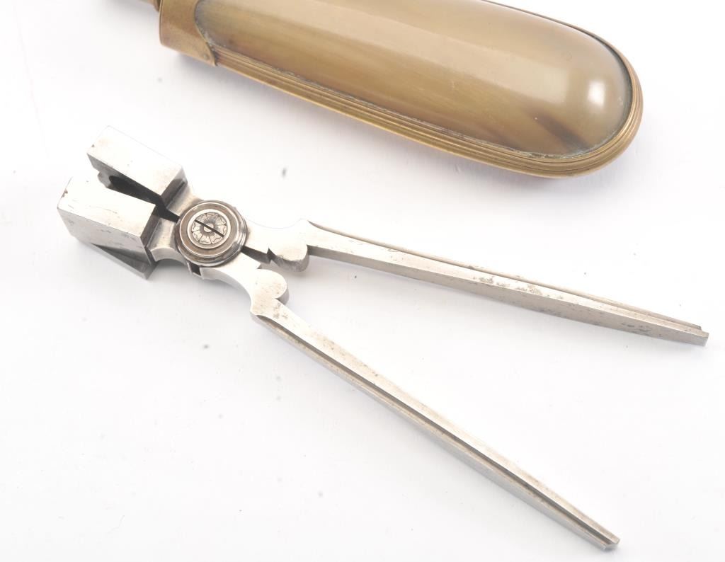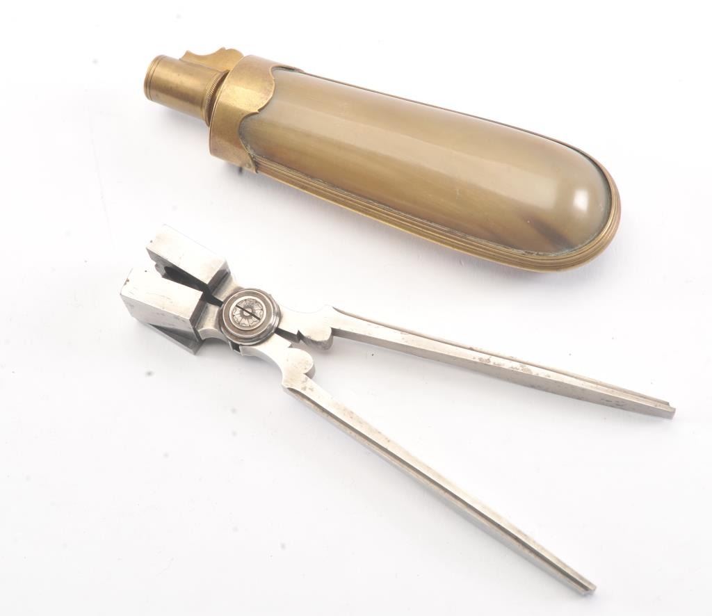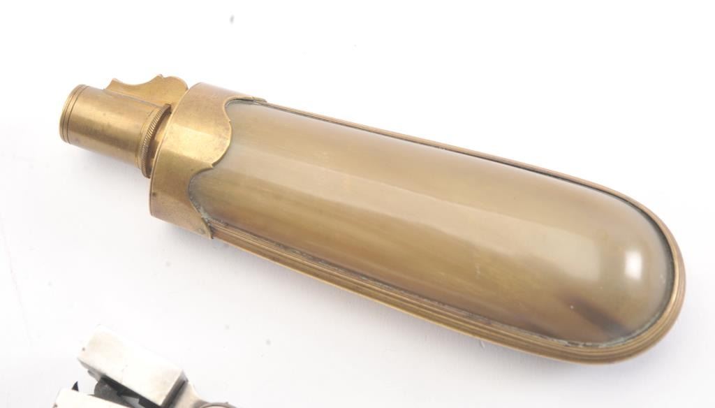 Napoleonic era horn and powder flask for French flintlock pistols circa about 1800-1815. The pair originally came from Belgium to America to be displayed with silver mounted Boutet pistol that waspresented to Belgium king. The flask is pressed horn in very good plus to near fine condition and measures 6 1/2" in length. The mold is matching in style and age and shows its original mirror bright polish and is near excellent. Both for about .50 caliber pistols. Sold at over $4000 U.S. by a noted Liege dealer. Est.: $400-$800
